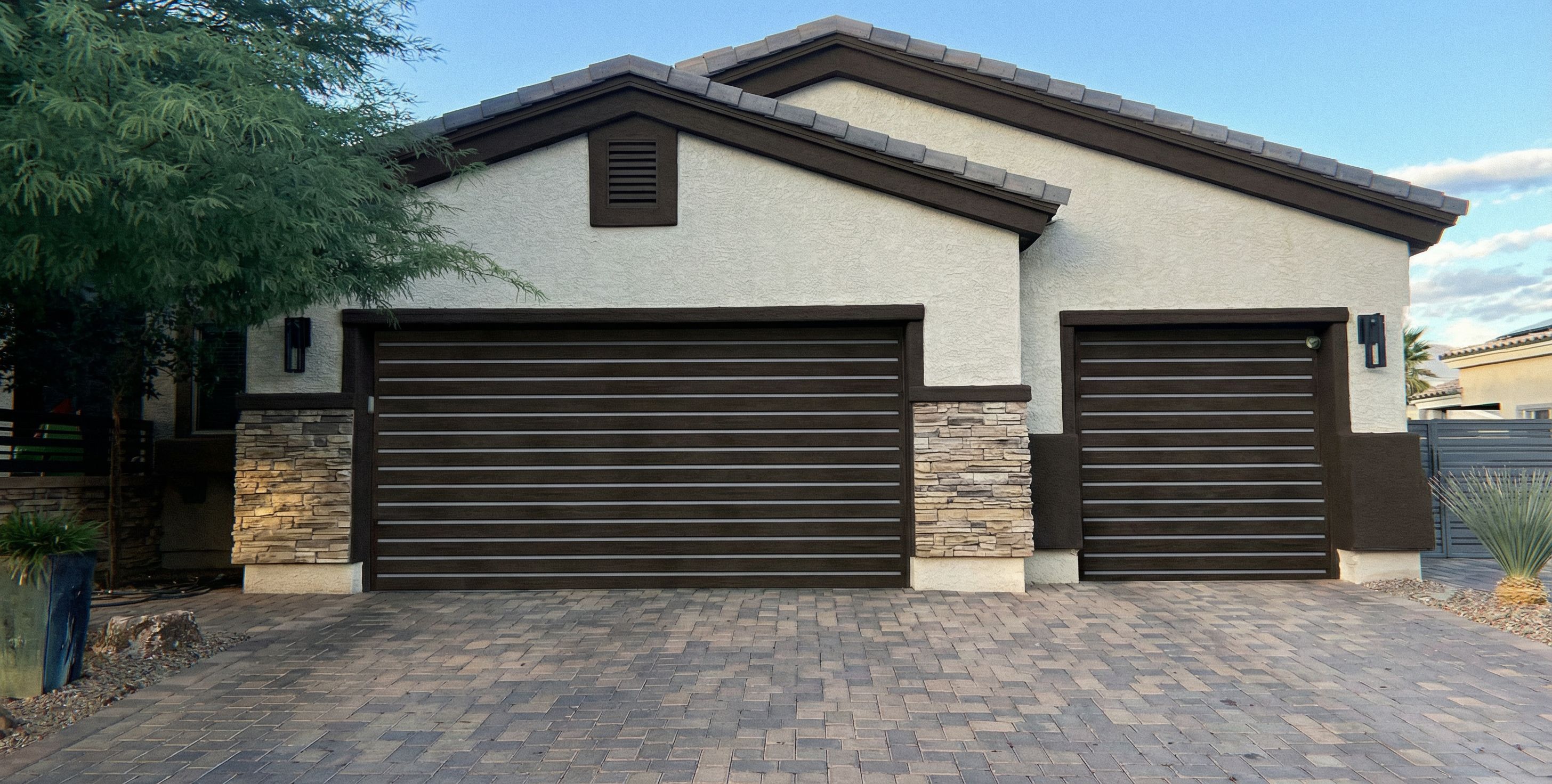 PromptReplace both garage doors with reference image. All trim to be espresso , keep exact camera angle