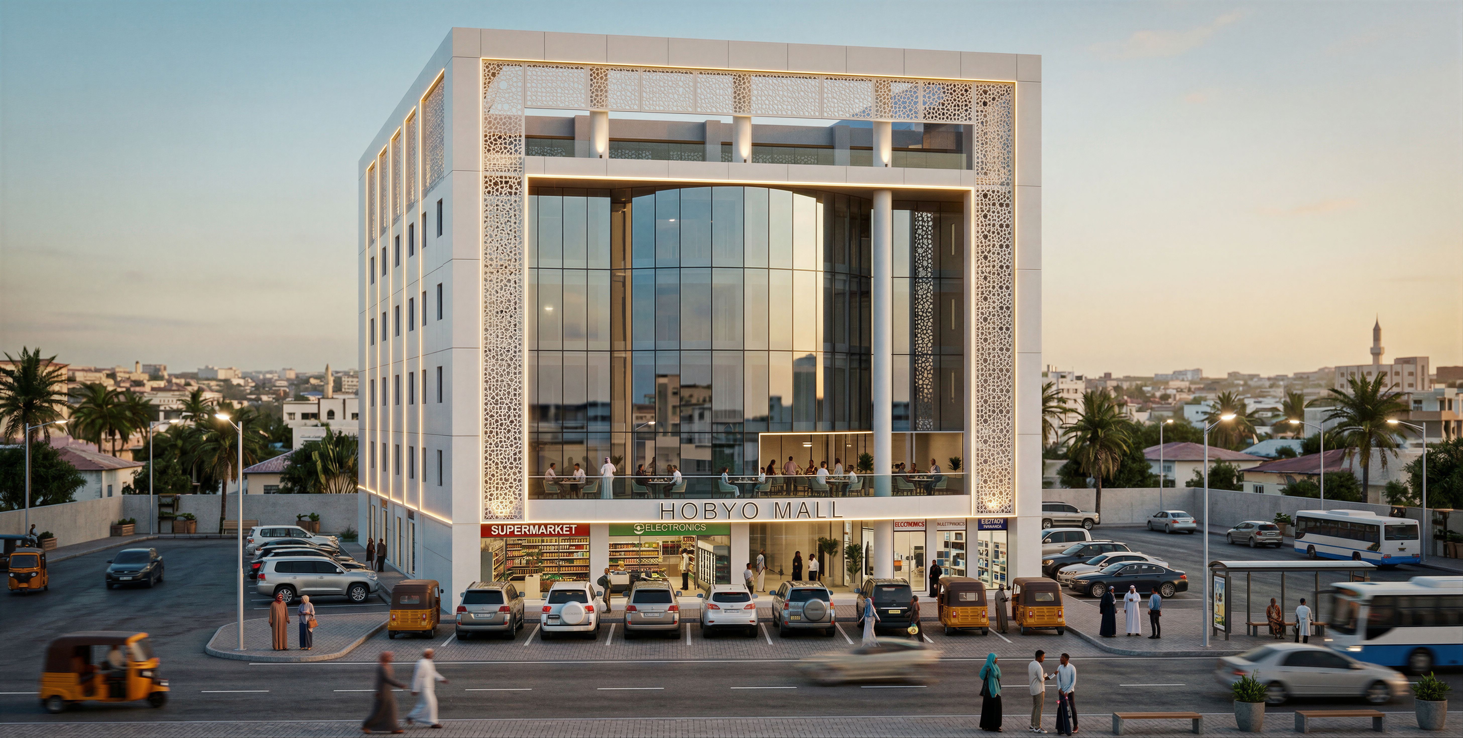 Commercial mall in Mogadishu Somalia. Make the glass realistic and reflective. Ground floor Supermarket and shops. First floor Restaurant with a balcony overlooking the road. Use white aluminium composite panels on the building . PUT PEOPLE OF SOMALI ORIGIN ON THE STREET. INCLUDE SOME SPOT LIGHTS, ROPE LIGHT AND STREET LIGHTS ON THE BUILDING. MAKE IMAGE HIGH RESOLUTION 8K. PUT NAME "HOBYO MALL" ON THE BUILDING. MAKE THE CURTAIN WALLING URVED AS IN THE ORIGINAL DESIGN AND INCLUDE RESTAURANT ON FIRST FLOOR WITH A GLASS BALCONY OVERLOOKING THE ROAD. MAINTAIN ORIGINAL DESIGN WITH THE CURVED CURTAIN WALLING ON THE FACADE., keep exact camera angle