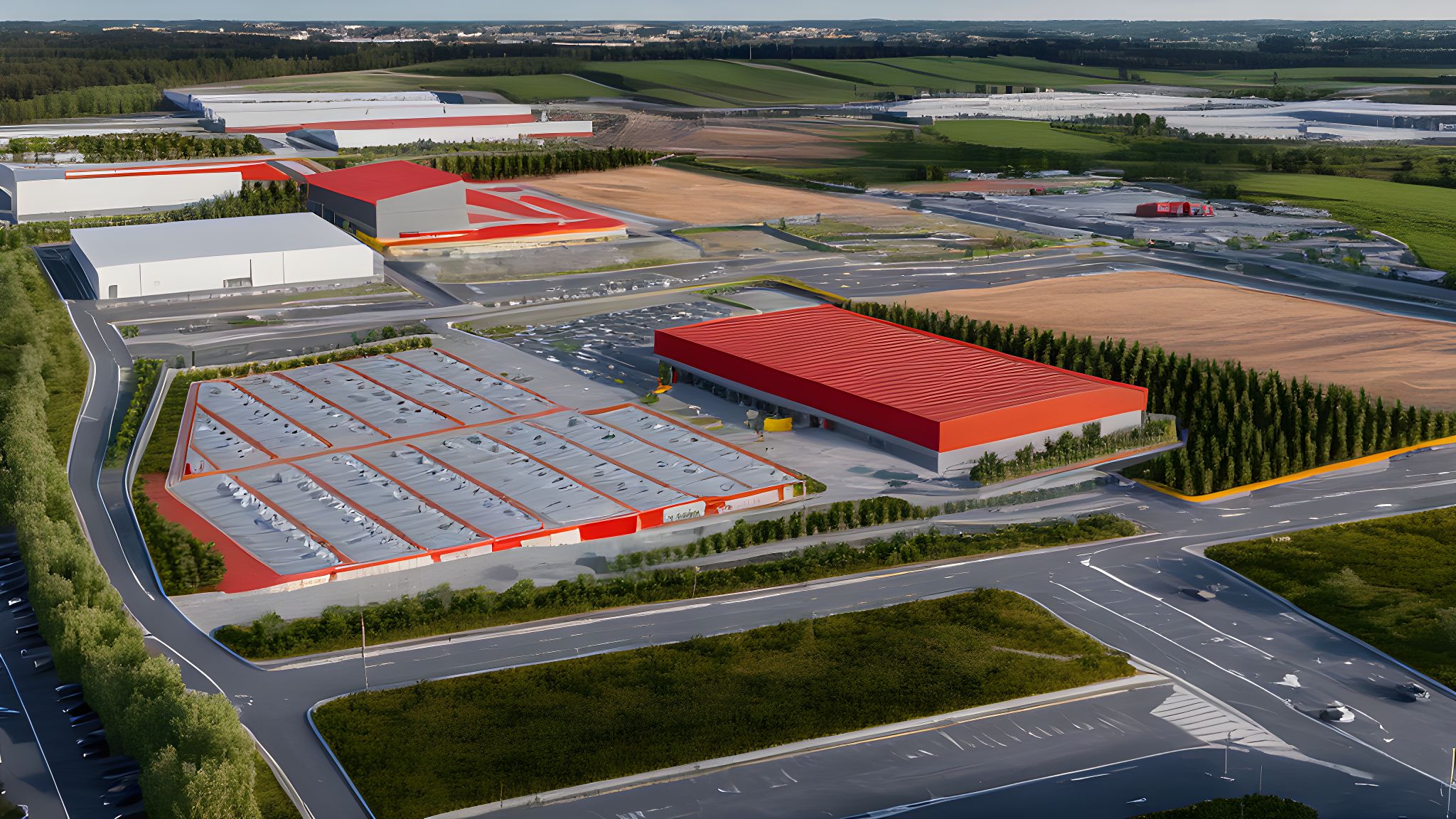 Promptthe buildings behind which are red and yellow ones are actually warehouses covered with grey color panels