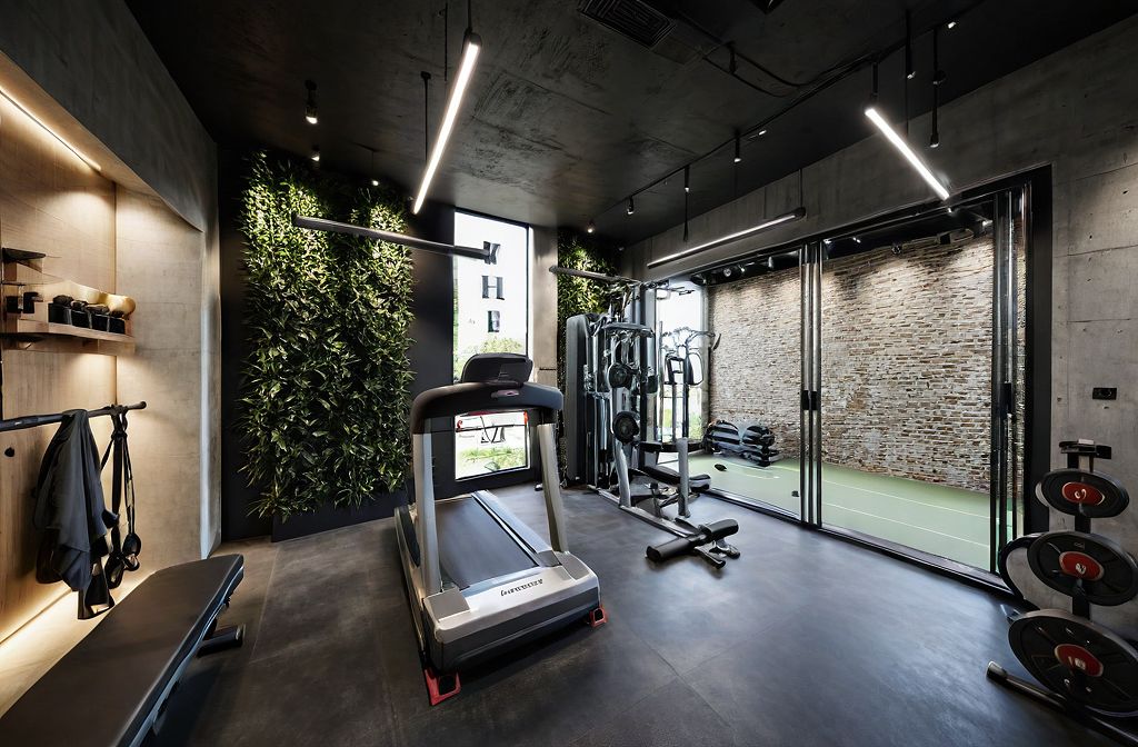 Modern interior fitness gym Photo of a modern gym interior featuring a treadmill and weightlifting equipment, with lush greenery integrated into the design. Focus on the combination of sleek black materials and warm concrete flooring, highlighting the gym's lively atmosphere. in the exterior, on the right side, has a view of a brick wall outside, providing context. Natural daylight floods the space, creating dynamic shadows and illuminating the textures of the equipment. Captured from a low angle to emphasize depth, with a wide lens that showcases the layout and elements harmoniously. With concrete walls