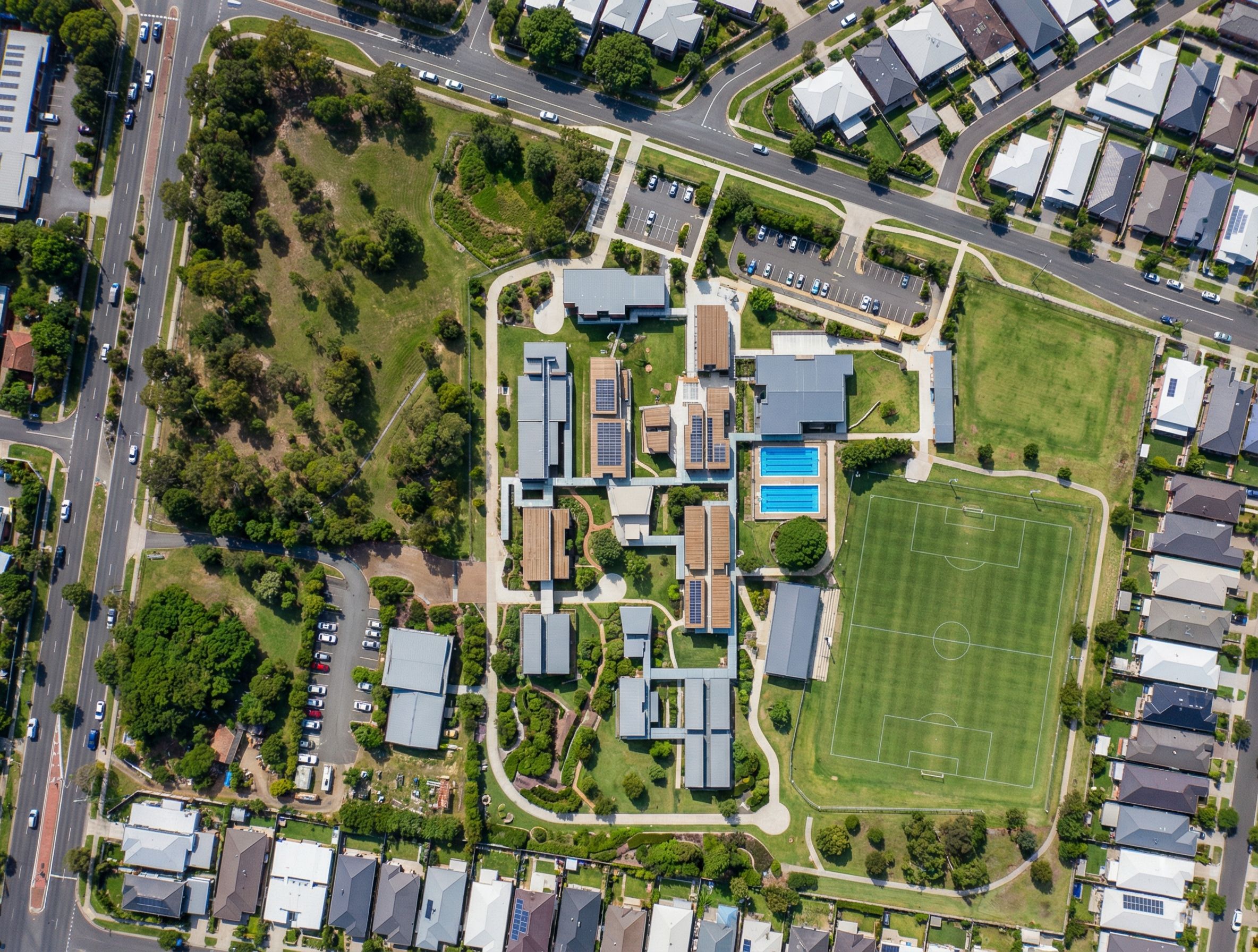 PromptPhoto of an educational facility complex featuring modular buildings and connected outdoor areas. The campus is set in a landscaped urban context. Dont add any other buildings, remove the carpark and sheds bottom left of the upload image. add a sports oval where the red rectangle is, show a high density housing development up to the bottom boundary and right hand boundary without roads. dont add any other roads. render the dark blue rectangles as 2 swimming pools