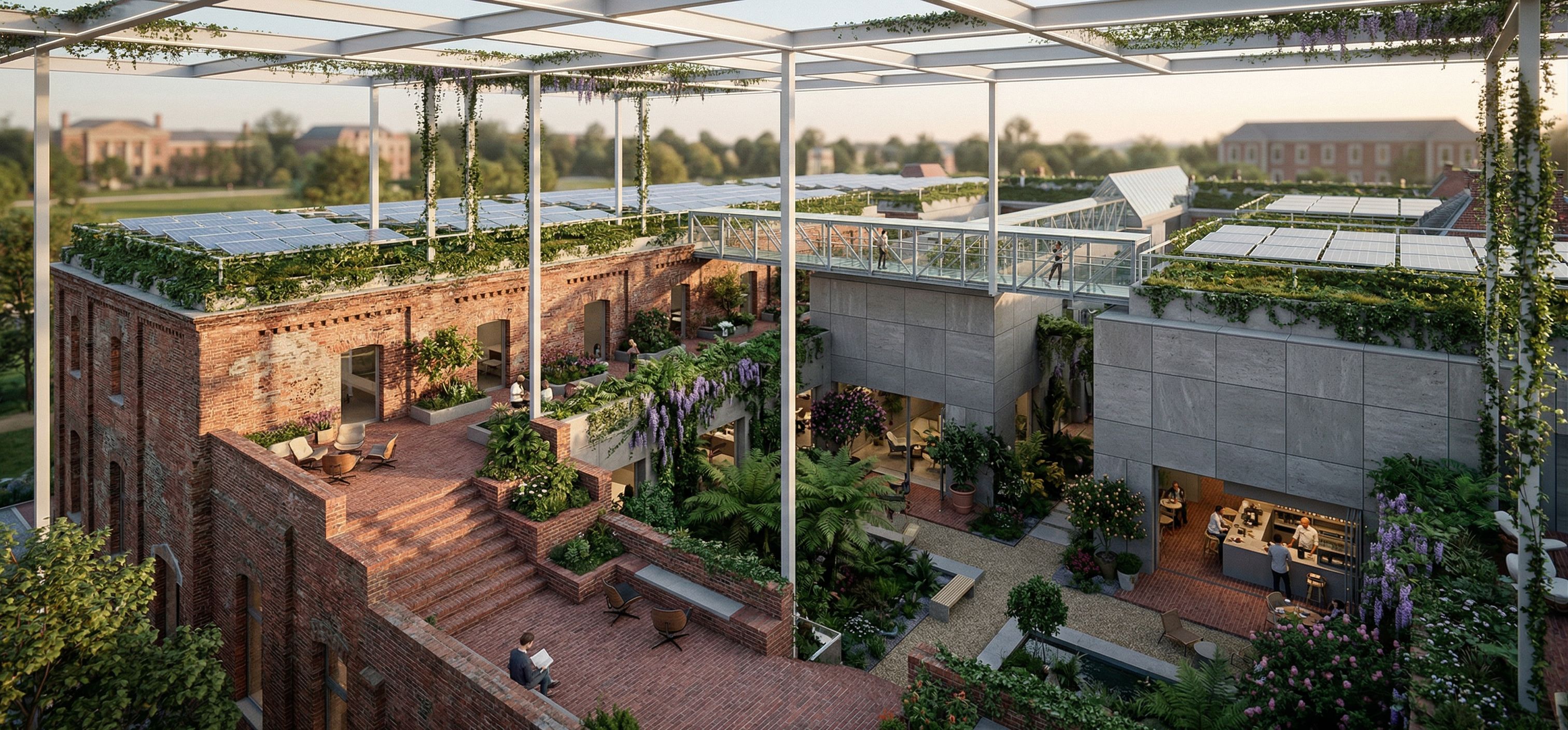 PromptThis block is composed of red brick walls from the early 1900s. The blue surfaces are also made of red brick. The building facades feature large open-air atriums composed of red surfaces clad in modular dove-gray stone panels, with 1 cm gaps between each panel. The green structures are made of white, square-section metal; the outdoor atriums are furnished with many plants and contain public spaces for people. Above the roofs, a glass walkway connects the various areas. Climbing plants also grace the roofs, along with photovoltaic panels for sun protection., keep exact camera angle