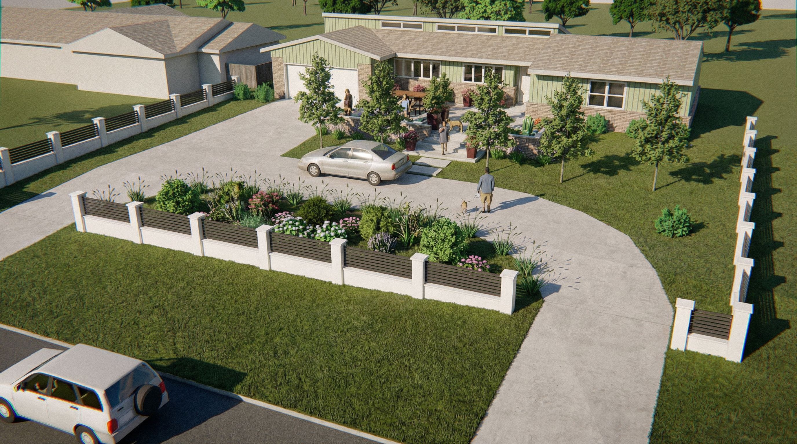 Photo of a modern single-family home nestled in a serene neighborhood, highlighting sleek architectural lines and a blend of brick and light green horizontal siding textures. Surrounding lush green landscaping with manicured gardens and pathways. Natural daylight illuminates the scene, casting soft shadows and enhancing the vibrant colors. Captured from a slightly elevated angle, with a wide-angle lens to emphasize the spacious front yard and driveway, featuring vehicles and figures interacting, adding a sense of life and community., keep exact camera angle