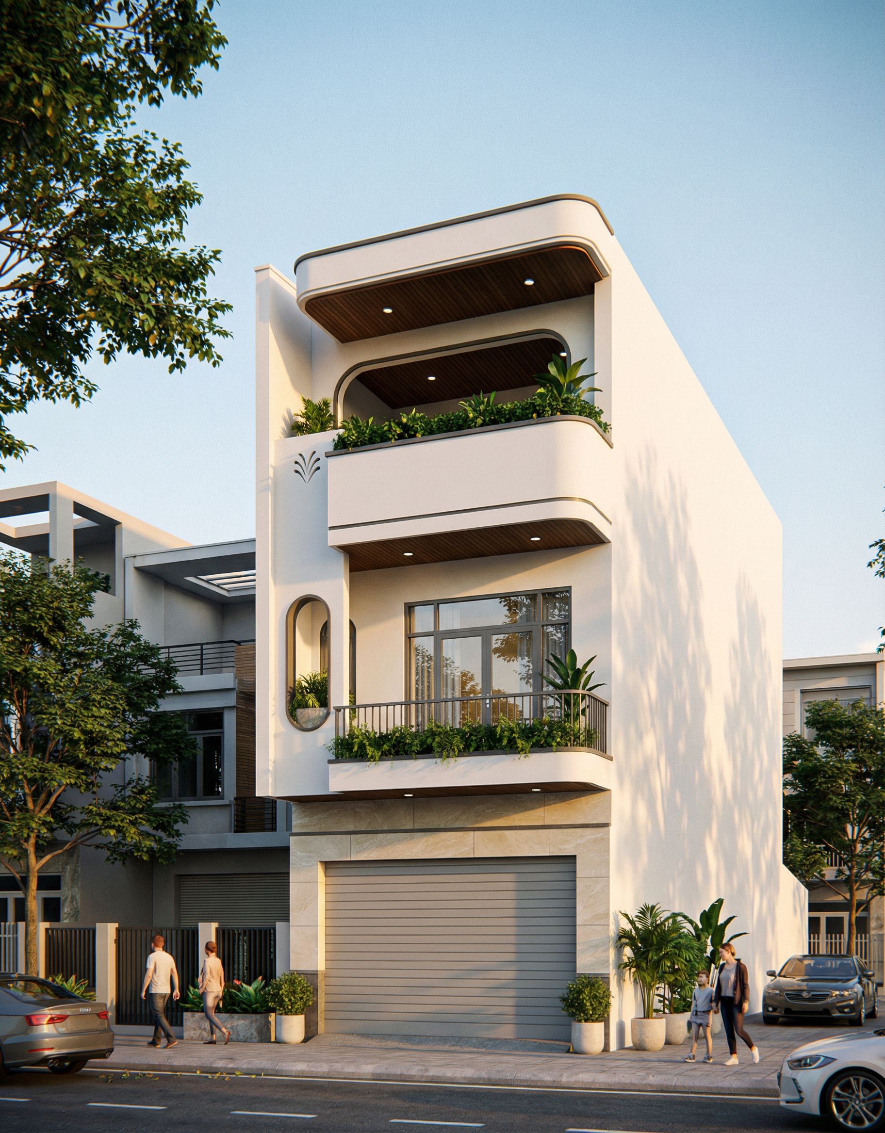 Photo of a modern residential building featuring sleek lines and minimalistic design elements. Highlight the smooth plaster facade with contrasting wooden balcony accents and lush green planters. Set in an urban context, surrounded by adjacent structures with evident city life. Soft afternoon sunlight casts gentle shadows, enhancing structural details. Captured from a low angle to emphasize height, using a wide-angle lens to create depth and perspective, showcasing the interaction between architecture and environment. Maintain the original camera angle and shape, but enhance the colors for better brightness and contrast. Describe the materials: Glass with realistic reflectivity; door frame made of aluminum painted gray. The paint color will be changed to white, and the first floor will be clad with cream-gray natural stone, laid in large slabs., keep exact camera angle