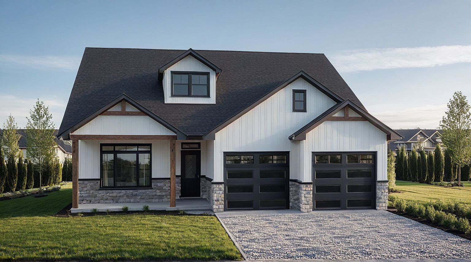 PromptPhoto of a modern single-family home featuring a combination of white siding and stone elements. wood posts and bracket details, flat grass lawn, urban neighbourhood setting