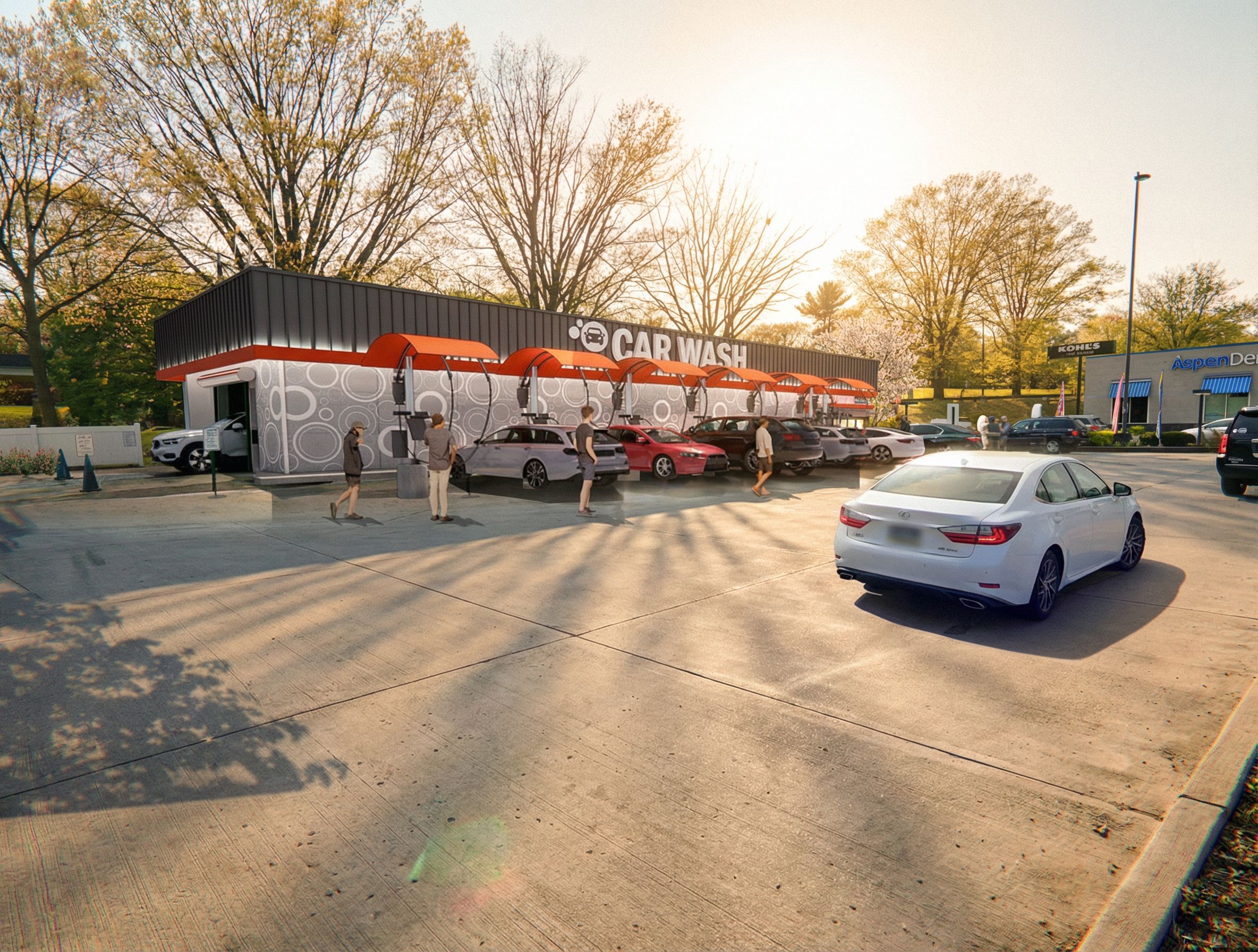 PromptPhoto of a modern car wash facility set in an urban environment, featuring sleek metal roofing, vivid orange accents, and a graphic facade. Surrounding elements include parked cars, trees in bloom, and a neighboring retail space. Soft late afternoon sunlight casts gentle shadows, enhancing the textures of the concrete surface and detailing on the building. Captured from a slightly elevated angle, the composition highlights the busy activity of customers and vehicles, evoking a vibrant, community-focused atmosphere., keep exact camera angle