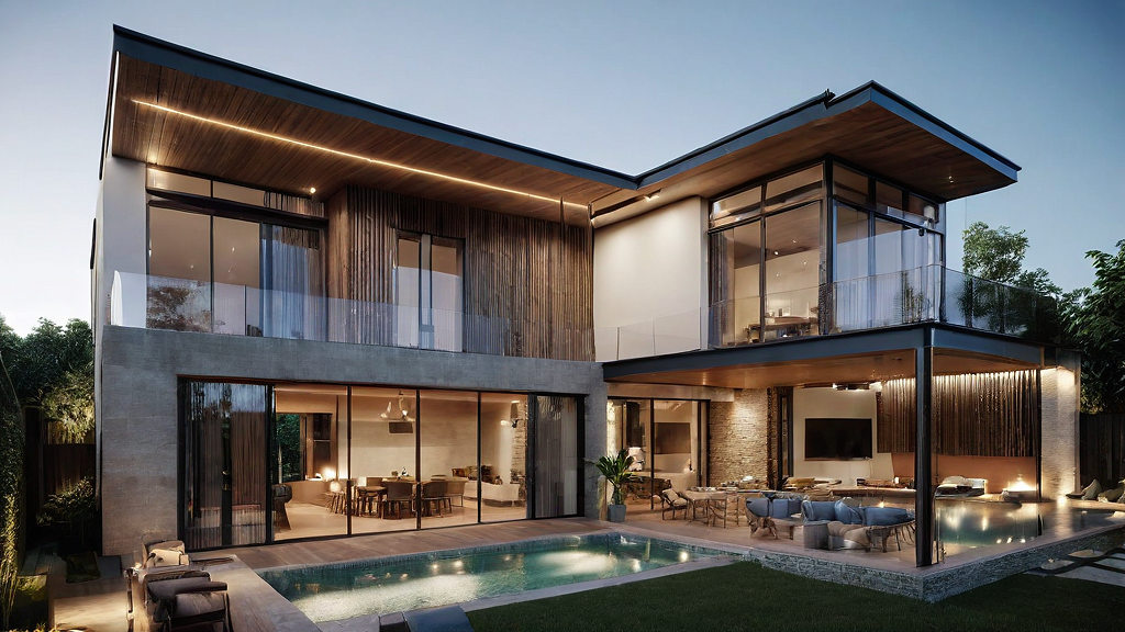 PromptPhotorealistic render of a house with improved artificial lighting. Keep the original shape, materials, and details of the house, including the pool. The lighting should be more realistic and well-distributed.