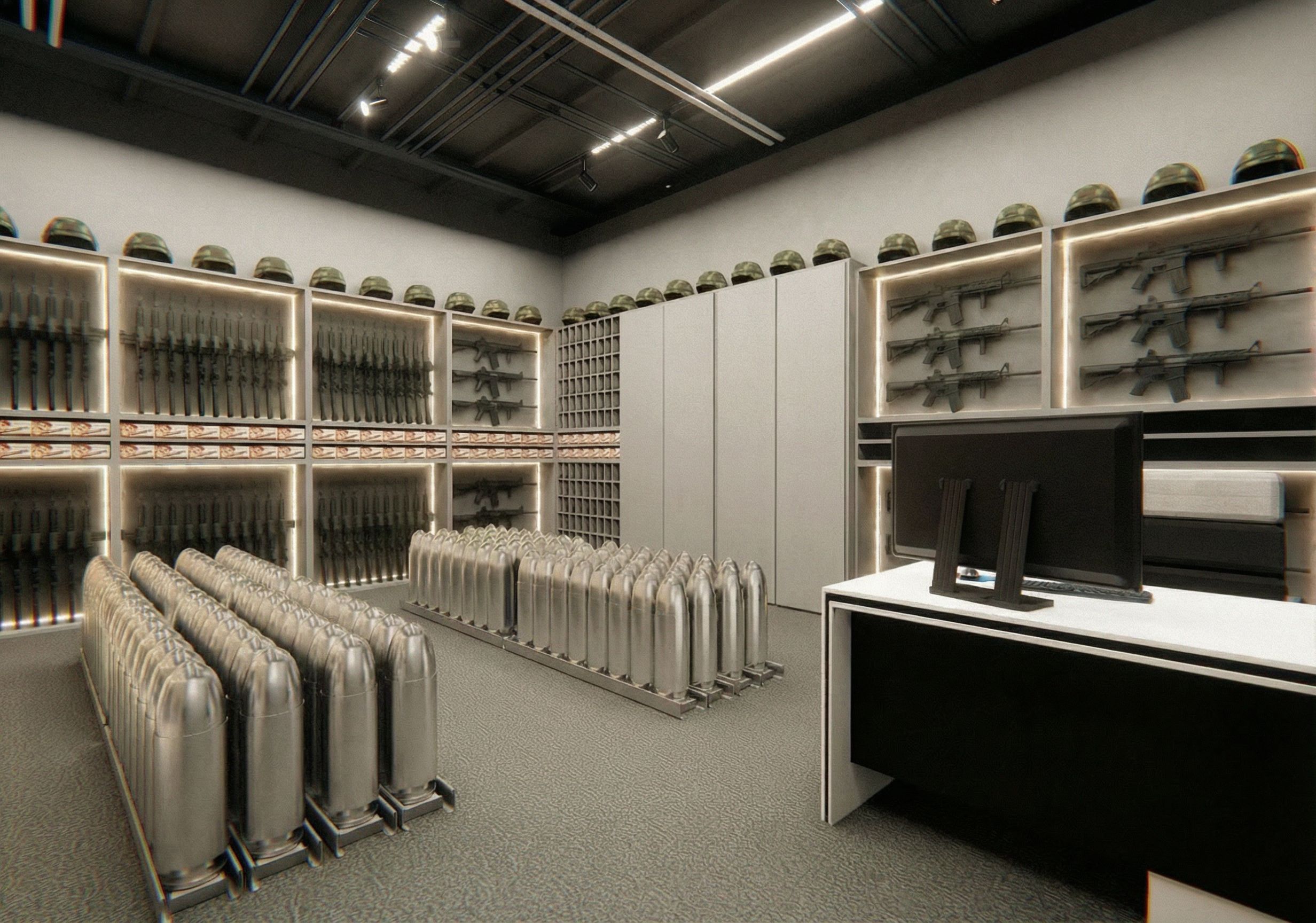 Prompt modifica el penúltimo módulo de la pared izquierda ya que las armas van en horizontal al igual que el último, no cambies los colores de los muebles , keep exact camera angle