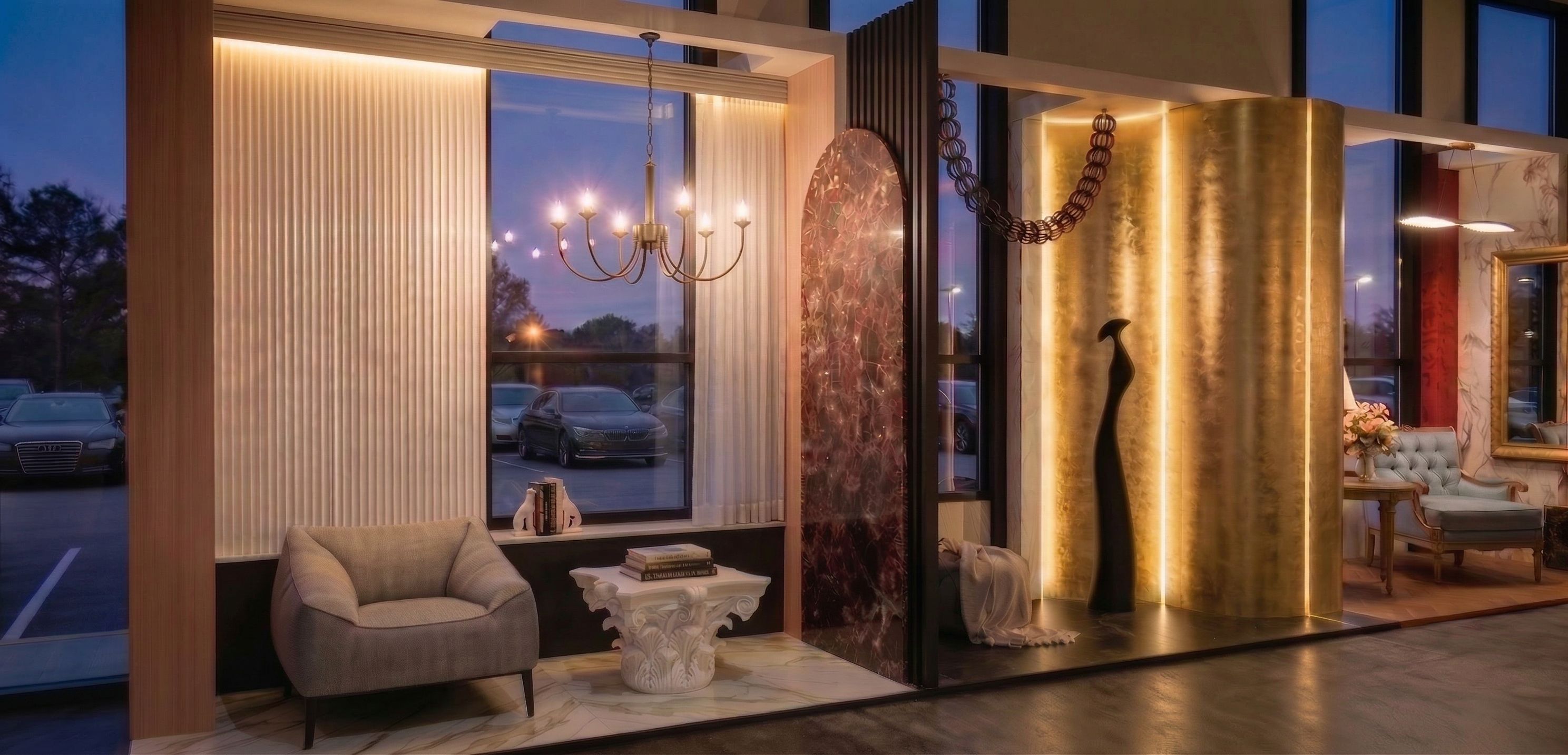 place a led stripe behind the curtain and fluted panel, behind the profile, only horrizontaly on the upper side, keep exact camera angle