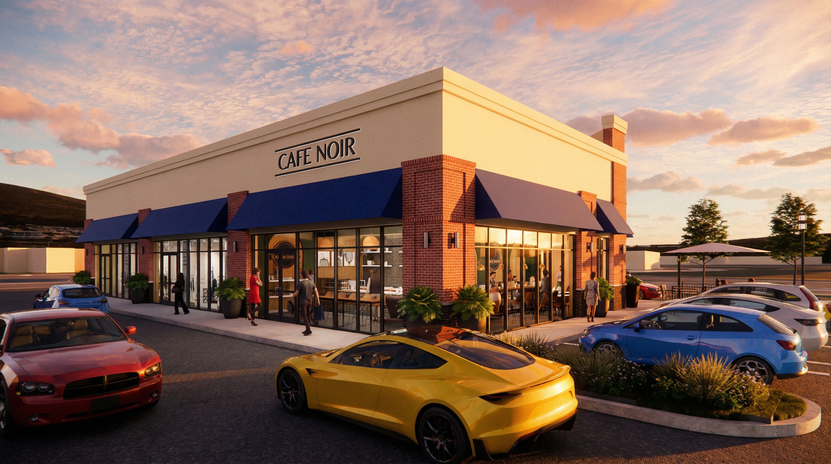 PromptPhoto of a contemporary restaurant with a brick facade, featuring large glass windows and blue awnings. Surrounded by a parking lot with several vehicles, including a striking yellow sports car. The exterior dining area is adorned with planters and a white umbrella, creating a welcoming atmosphere. Soft natural lighting during sunset casts gentle shadows, enhancing the textures of the materials. Captured from a slightly elevated angle to emphasize the building’s design and inviting setting, using a wide-angle lens for a comprehensive view of the surroundings., keep exact camera angle