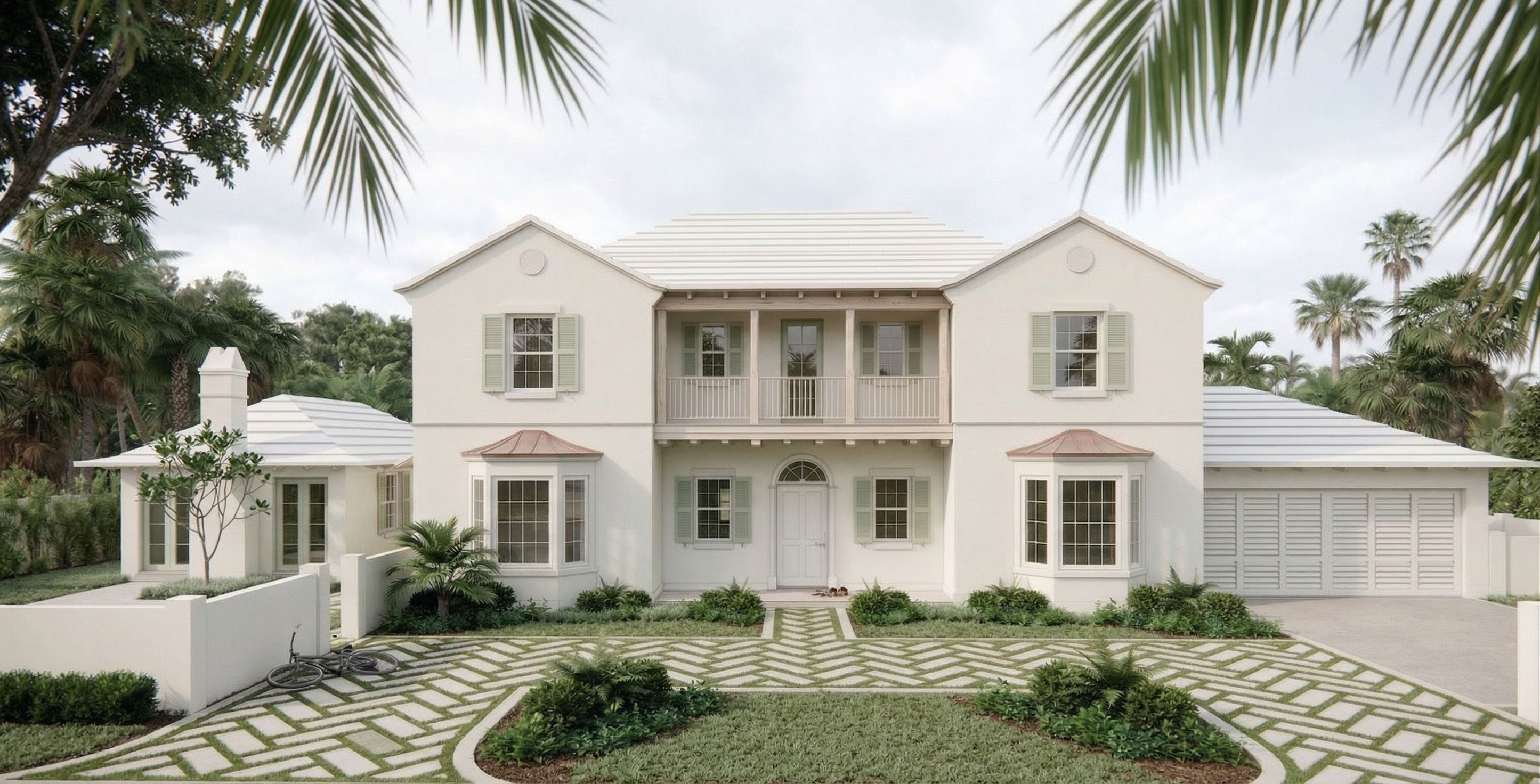 PromptUltra-photorealistic architectural “money shot” enhancement of the provided image. Do NOT change the architecture, massing, proportions, openings, materials, colors, roof, windows, doors, or camera view in any way. Do NOT alter any hardscape (driveway, walkways, paving pattern, or layout must remain identical). ONLY refine the landscaping. Reduce density — do NOT overplant. Landscaping should feel curated, minimal, and intentional rather than full or busy. Cabana area (VERY IMPORTANT): Simplify planting in front of the cabana Remove dense shrubs and cluttered planting Replace with a single elegant small tree or light specimen planting (such as a delicate palm or airy ornamental tree) Underplant with very low, soft groundcover only Maintain openness so the cabana remains visible and important Overall landscape direction: Keep planting soft and organic, but more restrained and refined Fewer plants, better placed Emphasize negative space and breathing room Avoid heavy layering or thick shrub masses Planting style: Low groundcovers with clean, soft edges Occasional medium shrubs, spaced out (not continuous hedges) Very limited focal plants — each should feel intentional Composition: Maintain a clean foreground — do NOT overcrowd near the driveway or lawn Subtly guide the eye to the entry using spacing, not density Keep symmetry loose and natural Privacy hedge behind site wall: Keep it soft and thin — not dense Semi-transparent so the cabana is still partially visible Irregular height for a natural feel Realism + tone: Muted green palette only No overly tropical, spiky, or busy plants No bright colors No visible dirt, but also no overly lush “jungle” look Lighting remains soft, diffused, and evenly lit. Final result should feel like a high-end, edited, “less is more” landscape design — soft, calm, and expensive — with a clear focal hierarchy and especially a clean, elegant cabana zone anchored by a single tree, while keeping everything else unchanged. , keep exact camera angle