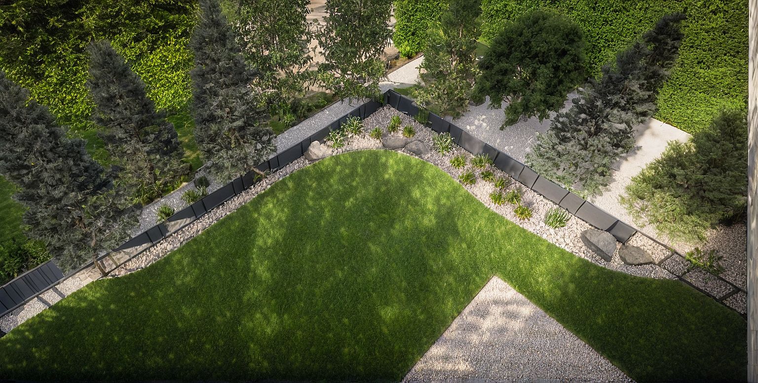 Photo of a landscaped garden corner featuring a curved stone pathway lined with greenery. Emphasize the textures of the foliage, including tall coniferous trees and flowering plants. The surrounding space is open and airy, with sunlight filtering through the leaves, creating dappled shadows on the ground. Captured from a high angle to showcase the layout, using a wide-angle lens to capture the full expanse of the garden and its natural elements, accentuating the vibrant colors of the plants against the neutral tones of the pathway.