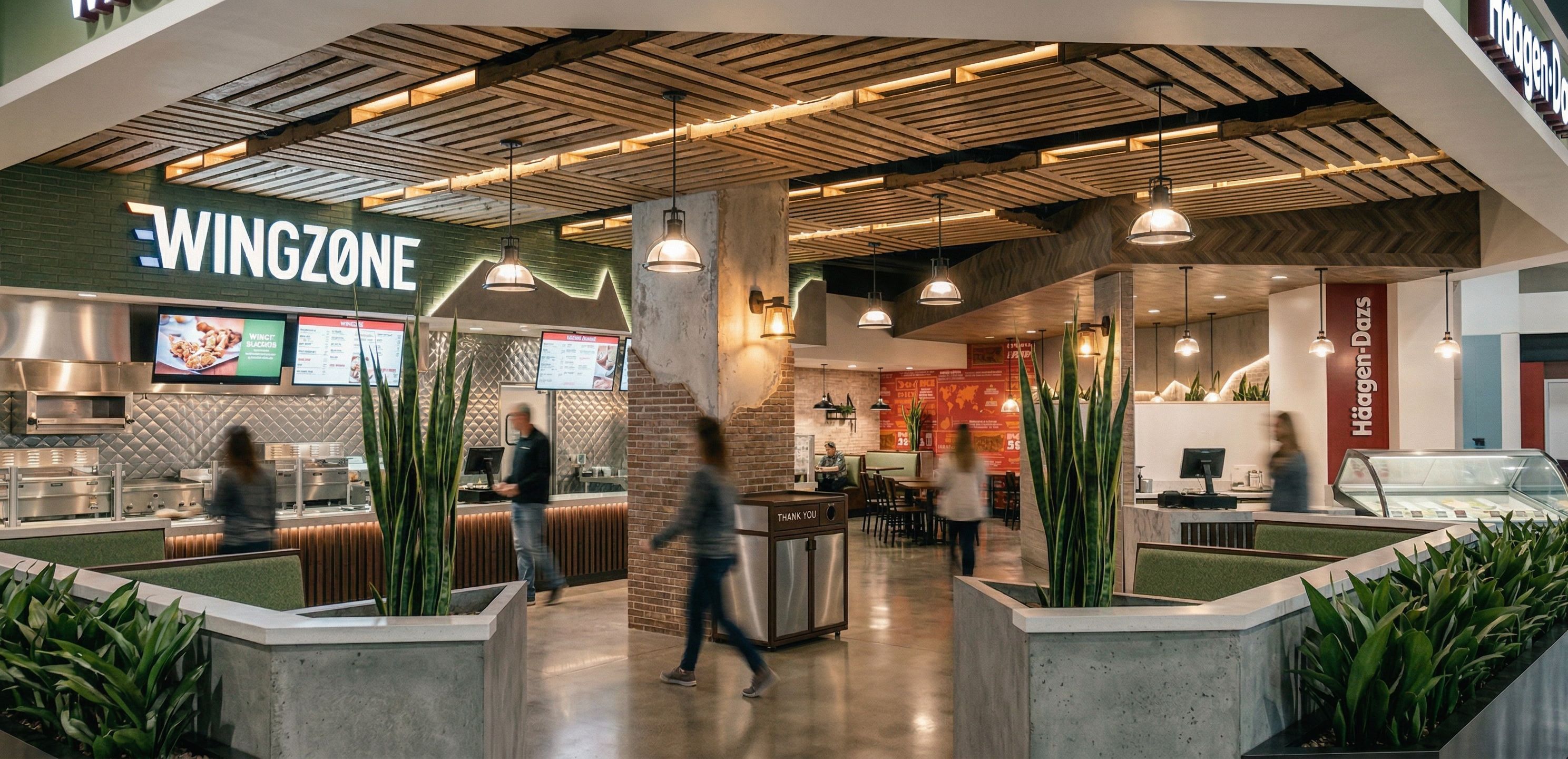 PromptAdd downlighting to the wood ceiling. Make the back wall of the cookline quilted stanless steel paneling. Leave everything else., keep exact camera angle