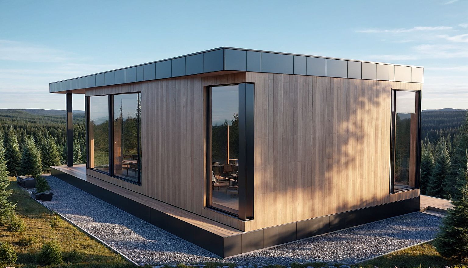 modern high-tech house with panoramic windows and with an outdoor terrace. Against the background of a coniferous forest.