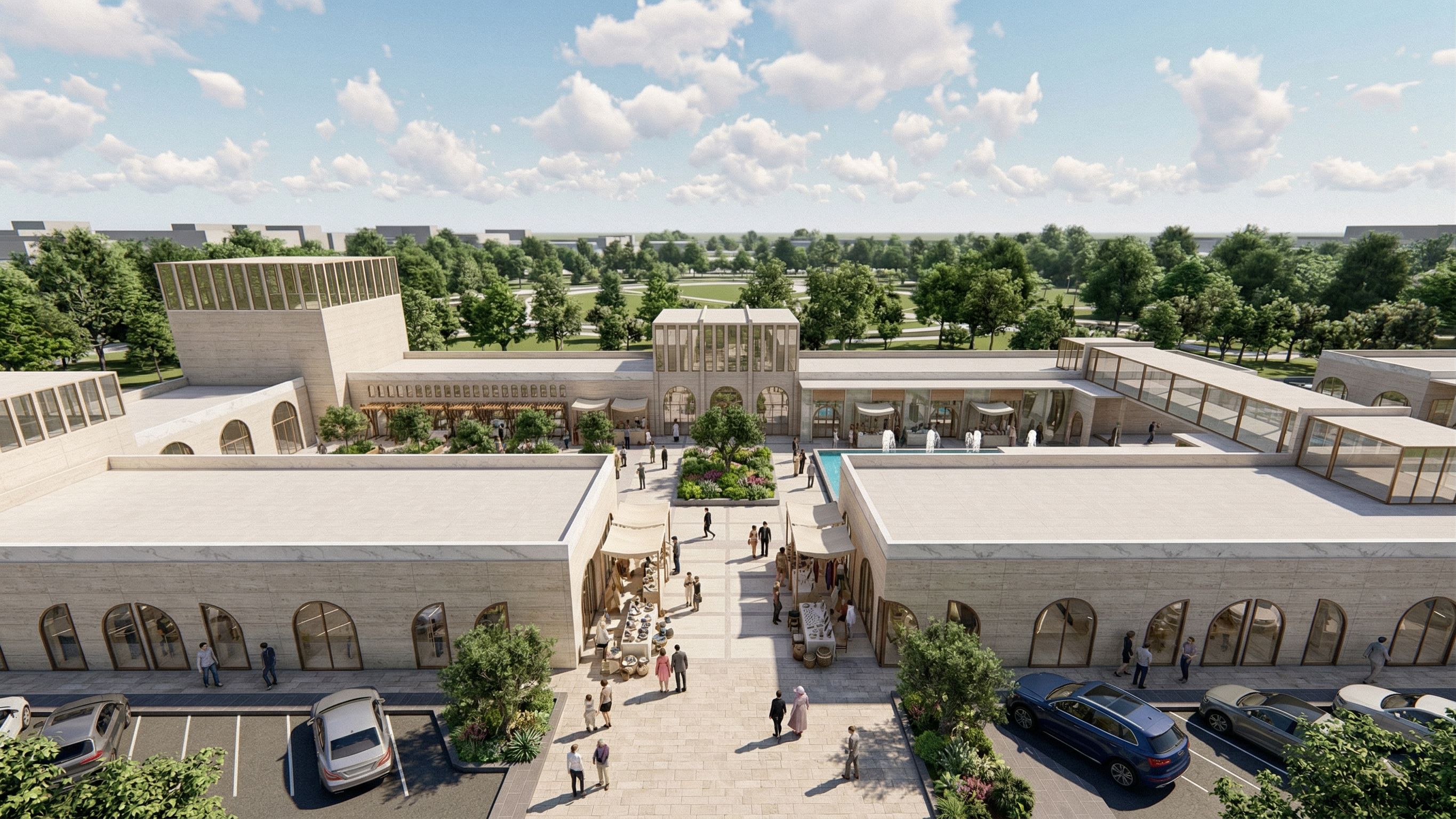 PromptPhotorealistic render of a vibrant open-air craft market with modern classical architecture, featuring buildings of stone and marble with substantial glass facades. Pedestrian pathways are paved with high-quality natural stone. Strictly maintain the original architectural structure without additions or alterations. Preserve the designated function of each area: green spaces must remain as lush gardens and tree groves, while water features appear as clear pools and fountains. Cinematic lighting, crisp details., keep exact camera angle
