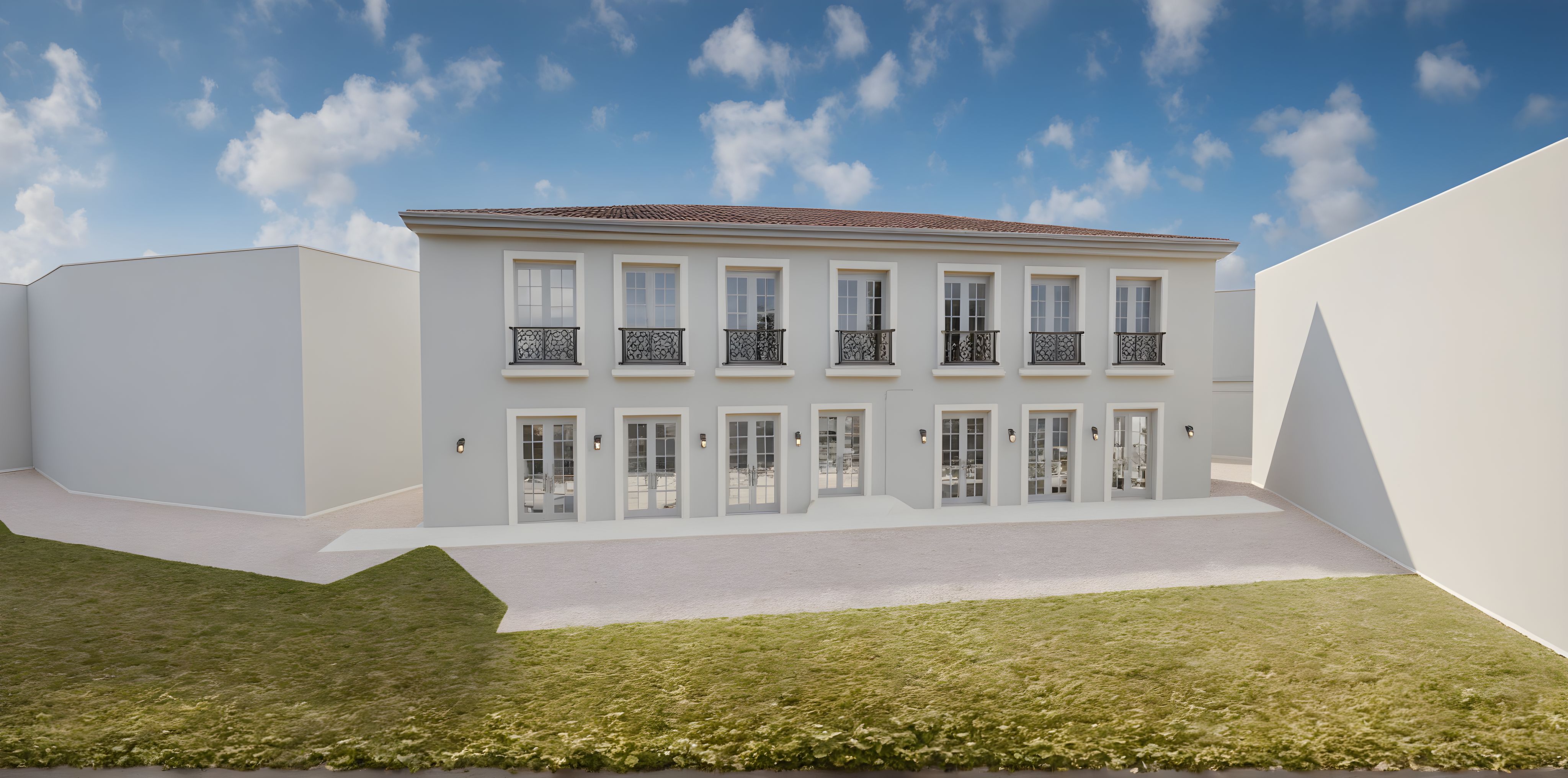 PromptPhoto of a two-story residential building featuring classical design elements, including balcony railings and large windows. The exterior showcases smooth plaster finishes with subtle detailing. Surrounded by a green lawn and concrete pathway, the structure is situated in a quiet urban environment. Natural daylight illuminates the façade, casting soft shadows on the ground. Captured from a low angle to emphasize the horizontal lines and symmetry, using a wide-angle lens for a broader view of the setting.