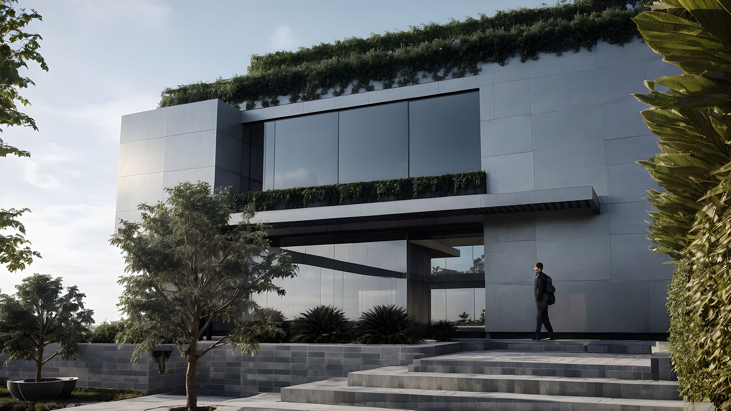 PromptKeep the structure, architecture, shape and forms of the model. The block is made of metal grey alucubond