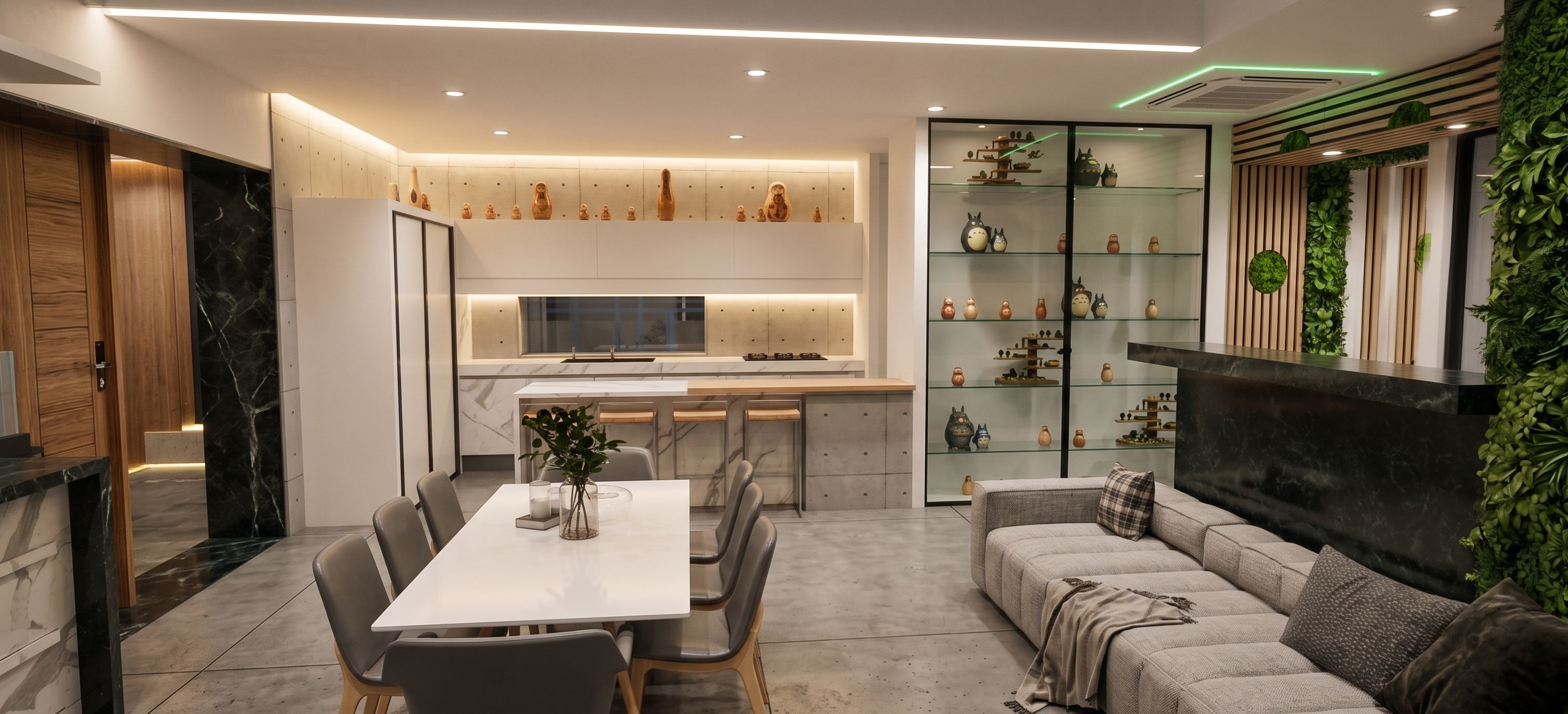 Promptcreates a high resolution highly photorealistic image, type "Professional PHOTO" Use the materials indicated in the picture; the brushy green; the sound-absorbing decorative panels with vertical and horizontal slats in light wood; light white plaster; exposed concrete brick linings with dots. Lounge-style diffused lighting. The green rectangle on the ceiling is a designer white grille air conditioner, on the ceiling. the table chairs are in gray leather and the frame in light wood., keep exact camera angle
