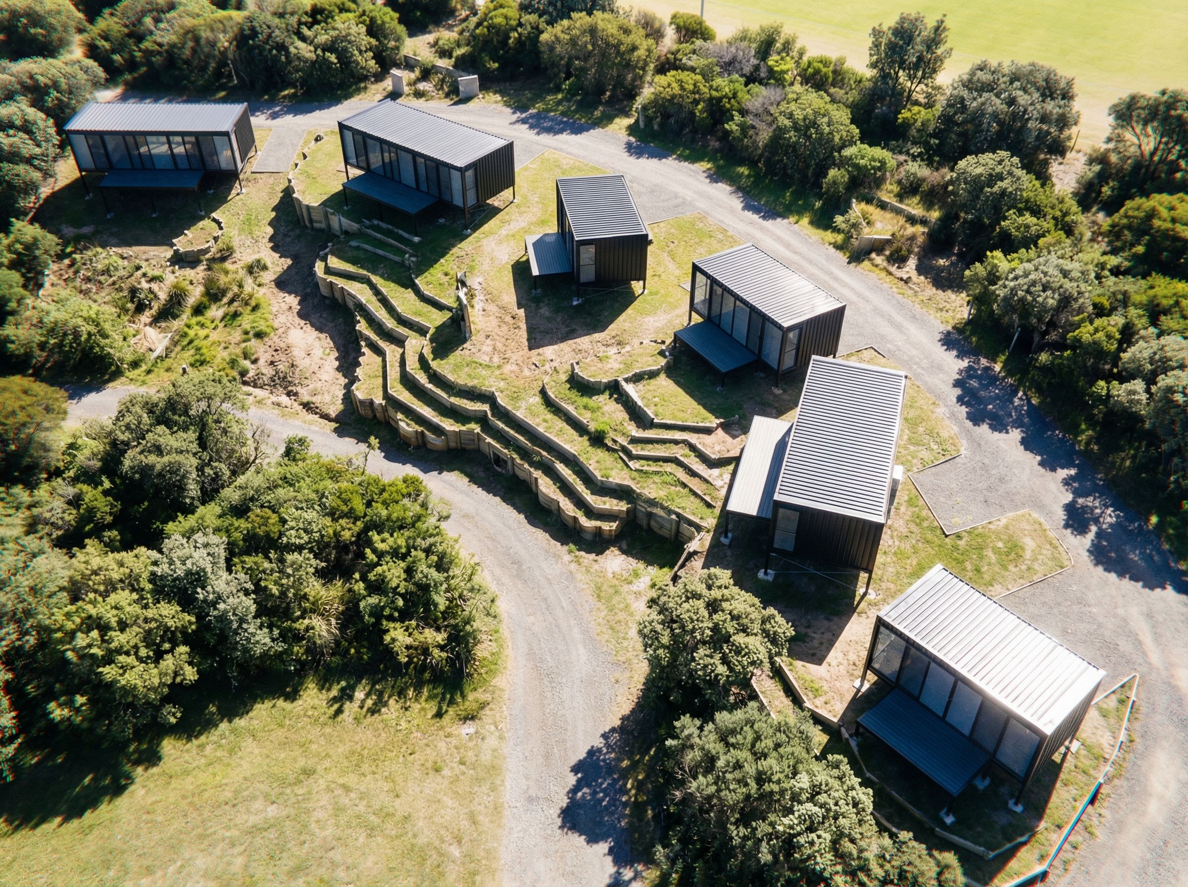 PromptDark vertical metal sheet cladding cabins to wall and roof, glazed openings with aluminium fly mesh over glazing, steel deck with FRP decking dark, keep form, siting is a landscape sloped site, exposed steel columns, gravel track, top view shot