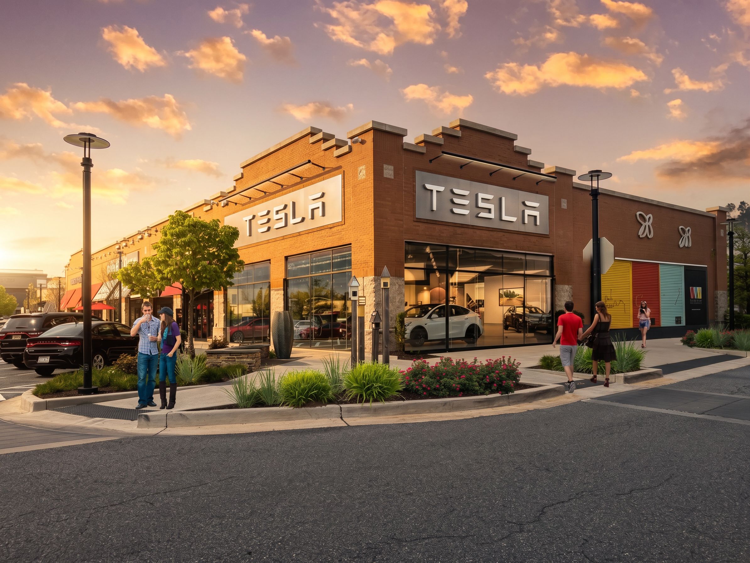 PromptPhoto of a modern retail building featuring a prominent Tesla storefront, emphasizing brick and glass materials, sleek lines, and dynamic shapes. Set in a vibrant urban shopping area, surrounded by lush landscaping and contemporary storefronts. Natural lighting during late afternoon creates soft shadows and highlights. Perspective captures an inviting street view with pedestrians interacting, framed by green plants and decorative elements, using a wide-angle lens to enhance depth and engagement. Keep the camera angle, the sun rays coming from the left of the image. create soft shadows, keep exact camera angle