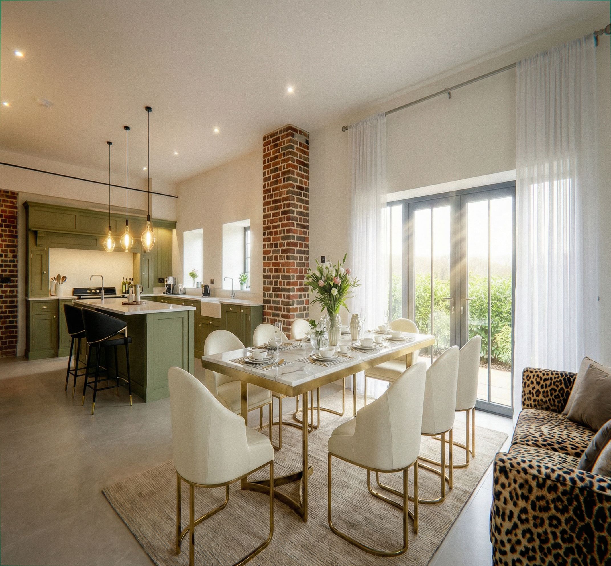change curtains not tied back, change sofa to tiger print, remove pattern on rug, ad shrubs outside, add sun beams through window, keep exact camera angle