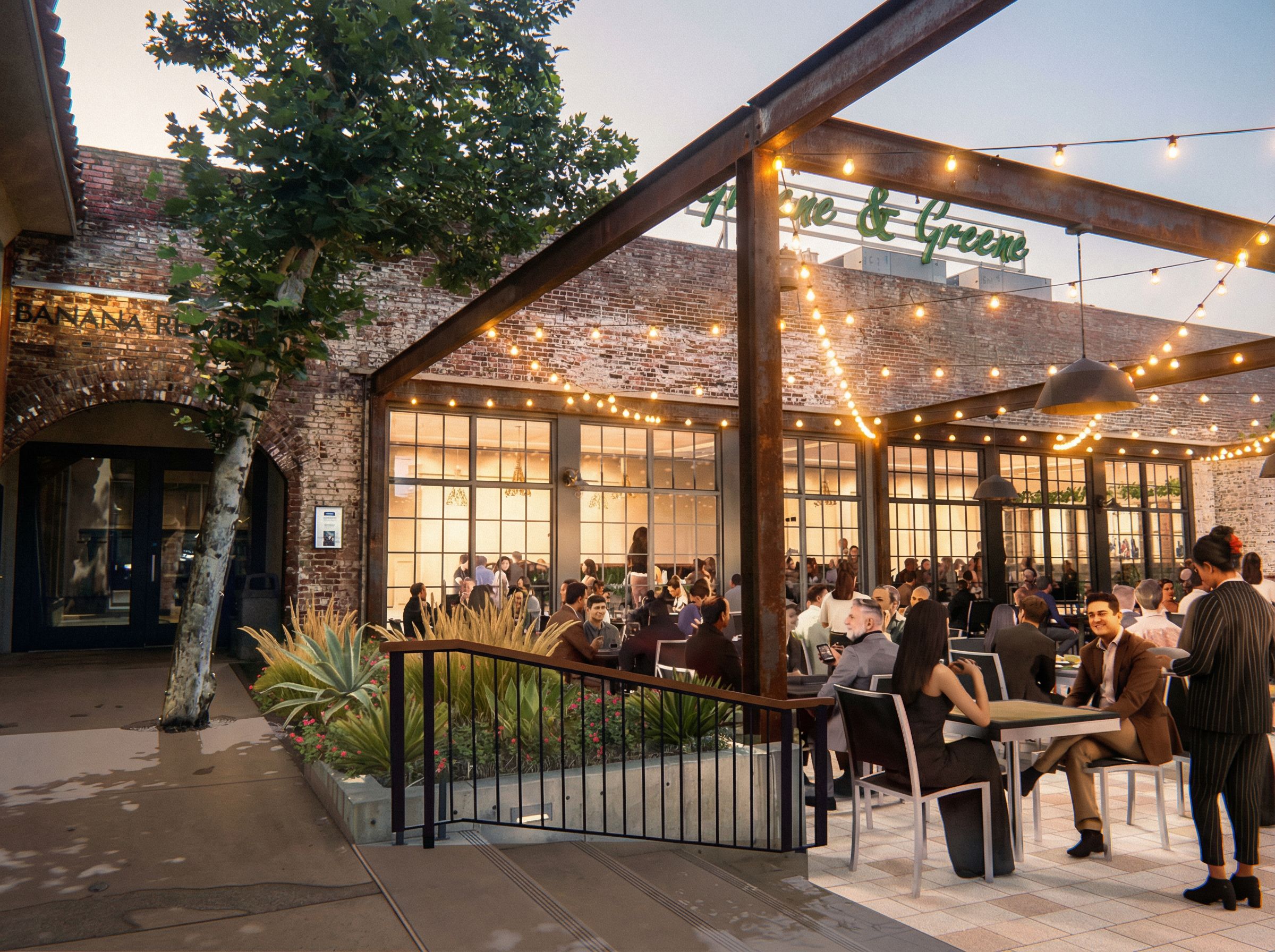 PromptPhoto of a modern dining establishment with a vibrant outdoor seating area surrounded by lush greenery. The structure features exposed brick walls, large glass windows, and an industrial metal framework. The setting is enriched by charming string lights overhead, creating a warm ambiance during twilight. The angle captures both the inviting interior and the lively exterior, framed by plant accents, while soft, natural light enhances the textures of the materials and the bustling atmosphere of patrons enjoying their meals., keep exact camera angle
