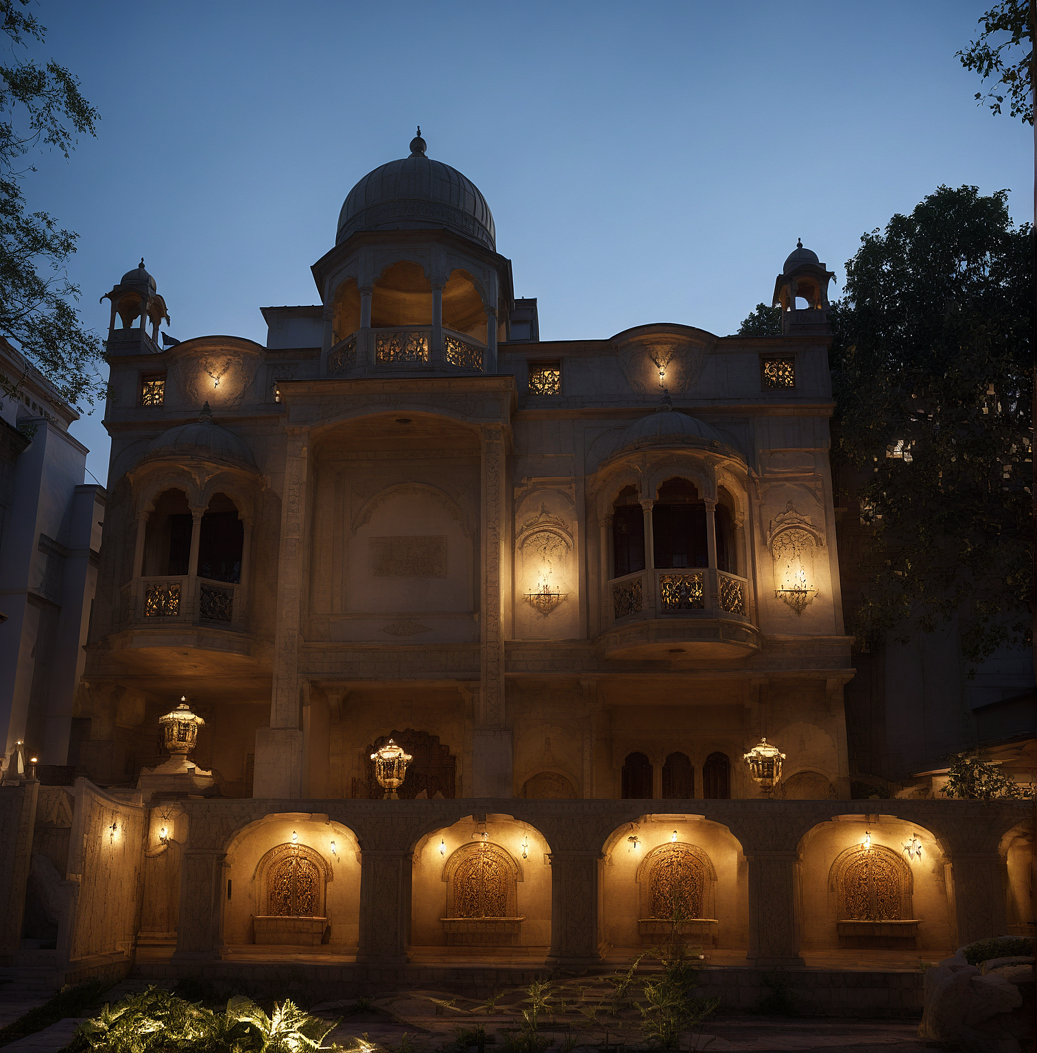 PromptRender a heritage-style building at night with soft, indirect warm lighting. Use golden ambient illumination to subtly enhance intricate carvings, domes, and balconies. Ensure the lighting appears naturally diffused, emanating from hidden sources such as recessed fixtures, archways, and beneath balconies. Create a balanced contrast between the warm glow and the cool evening environment. Enhance textures with realistic depth, ensuring shadows and highlights bring out the architectural richness. The overall ambiance should feel grand, sophisticated, and timeless, with an inviting yet dramatic lighting effect