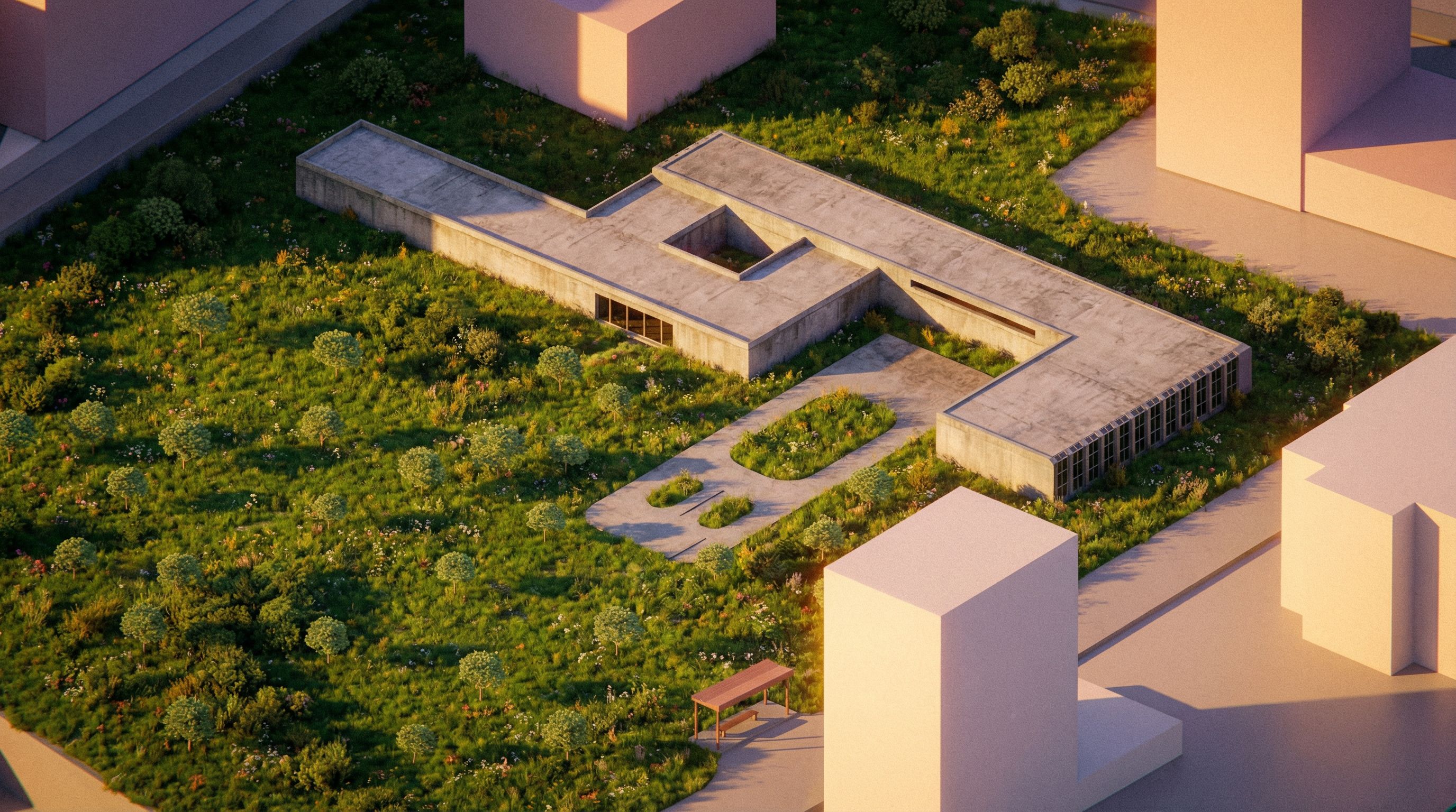 PromptThe reinforced concrete building and the surrounding green area will have realistic and striking green landscaping., keep exact camera angle
