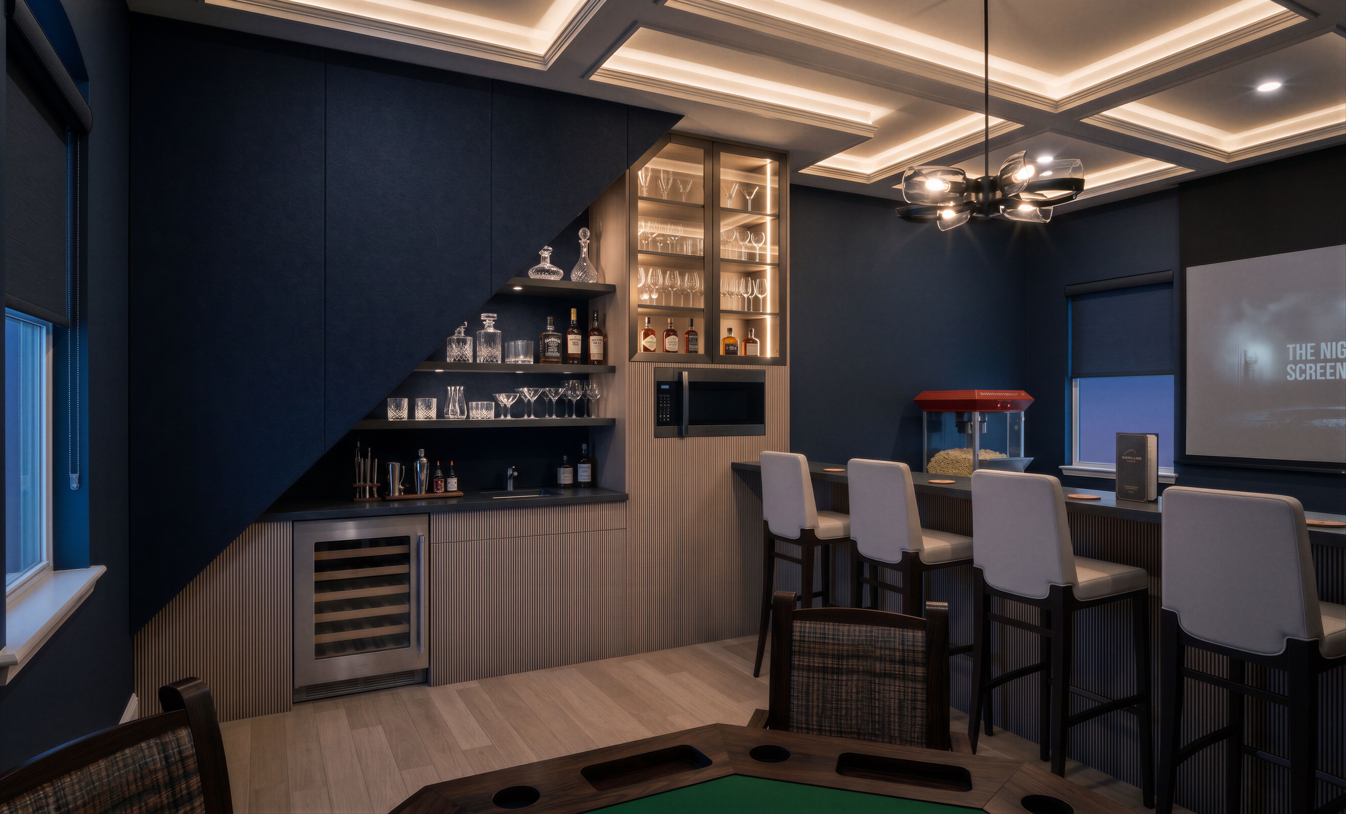 Make photorealistic rendering of this media room; Add wall design as appropriate for a media room and trending now; Add ceiling design as appropriate for a media room and trending now; Add colors as is a trend now for a media room; Picture right of the back window is a projection screen; Add light fixtures as appropriate, light fixtures on; Add appropriate items to the current wet bar cabinets; Tall cabinet next to wet bar has glass elements above the microwave; Glassware on the shelves above the sink; There is a popcorn machine to the left of the existing window on the back; Do not add extra windows; Do not add another window; Windows have blinds as appropriate for a media room; Only skies are seen through the windows, keep exact camera angle