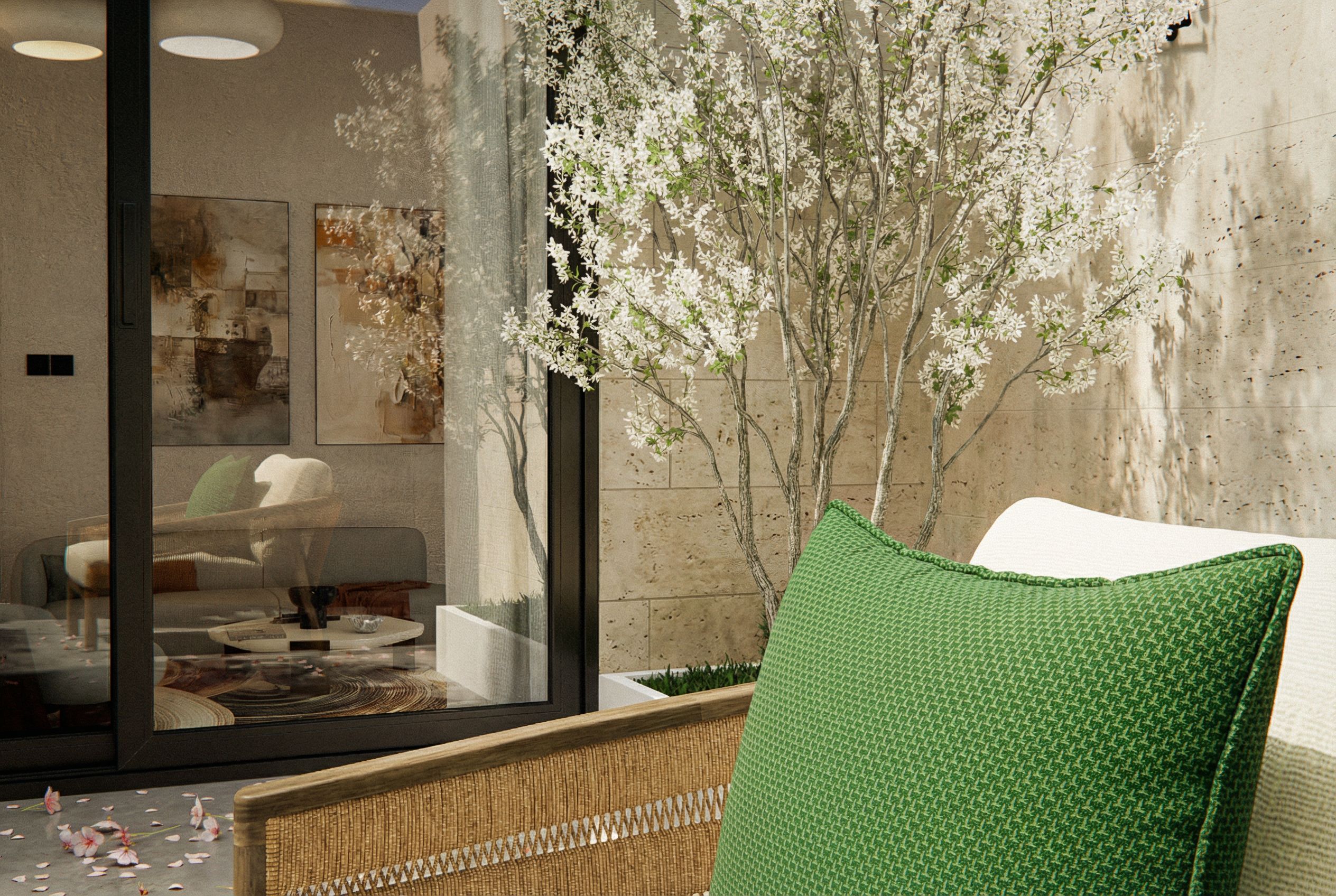PromptUltra-realistic exterior render of a stone travertine wall with a glass door showing the interior, and an outdoor seating area . Preserve the exact layout, composition, and all design elements without any changes. Apply realistic sunlight and natural lighting, realistic shadows, and high-quality material textures for stone, glass, and metal. Enhance material details and reflections while keeping the scene exactly as it is. Photorealistic, high-resolution, cinematic lighting.”, keep exact camera angle