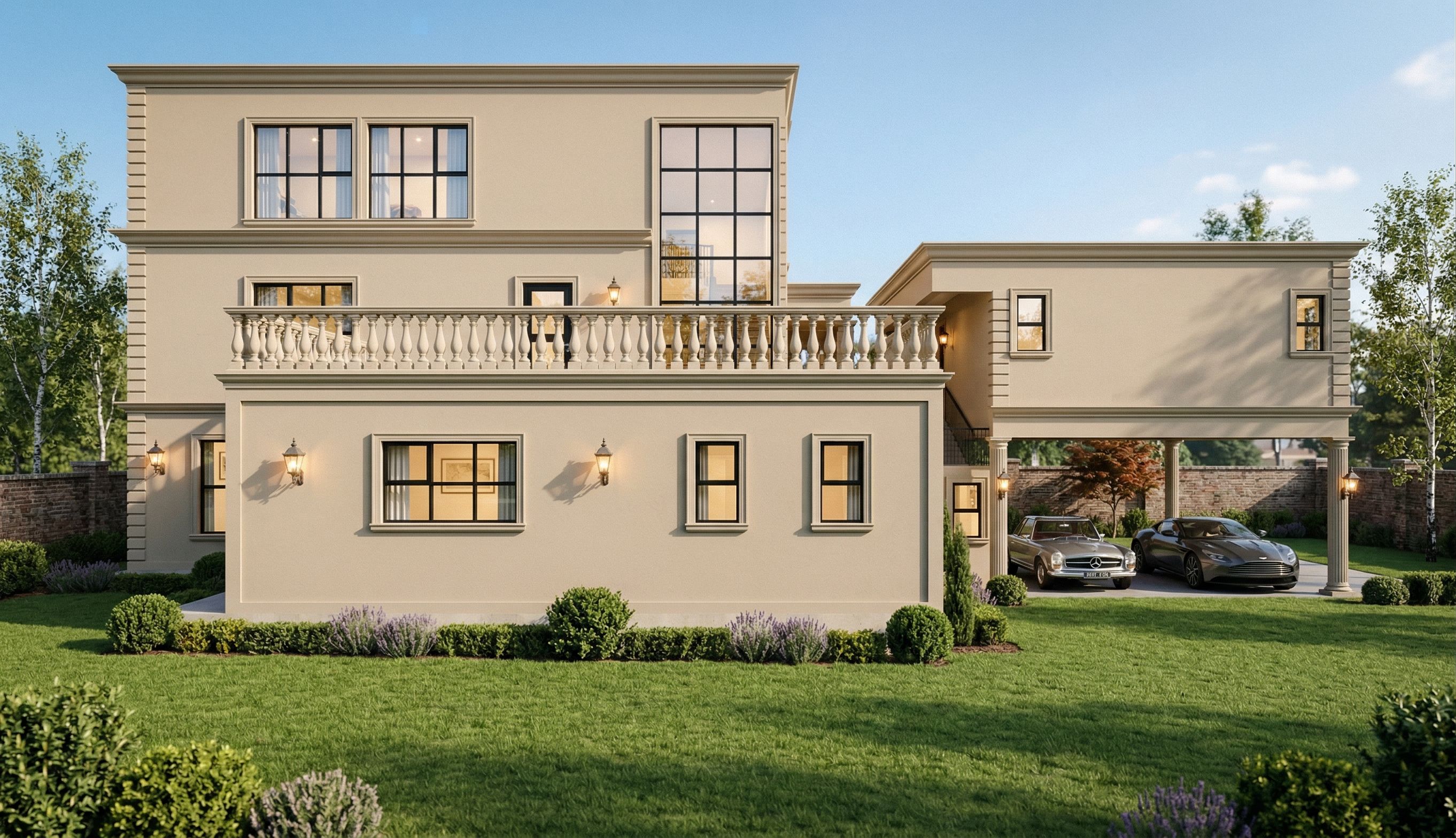 PromptCreate a daytime ultra-photorealistic architectural render of a classical residence. The house features symmetrical classical proportions with smooth warm beige plaster walls, decorative corner quoins, moulded cornices, and black aluminium framed windows and doors with clear reflective glazing. A projecting upper floor volume forms a covered carport supported by slender classical columns, sheltering cars beneath. Surround the house with a neatly maintained lawn and integrate lush landscaping including low ornamental bushes and trimmed shrubs along the foundation edges. Add several medium-height trees and soft background vegetation beyond the boundary wall to create depth and a natural suburban setting. Lighting should depict bright natural daylight under a clear sky, producing soft but defined shadows across the façade. All exterior lantern-style wall lights mounted beside doors and windows should be turned on, and interior lighting should also be visible through the windows to create a lived-in atmosphere., keep exact camera angle, keep exact camera angle