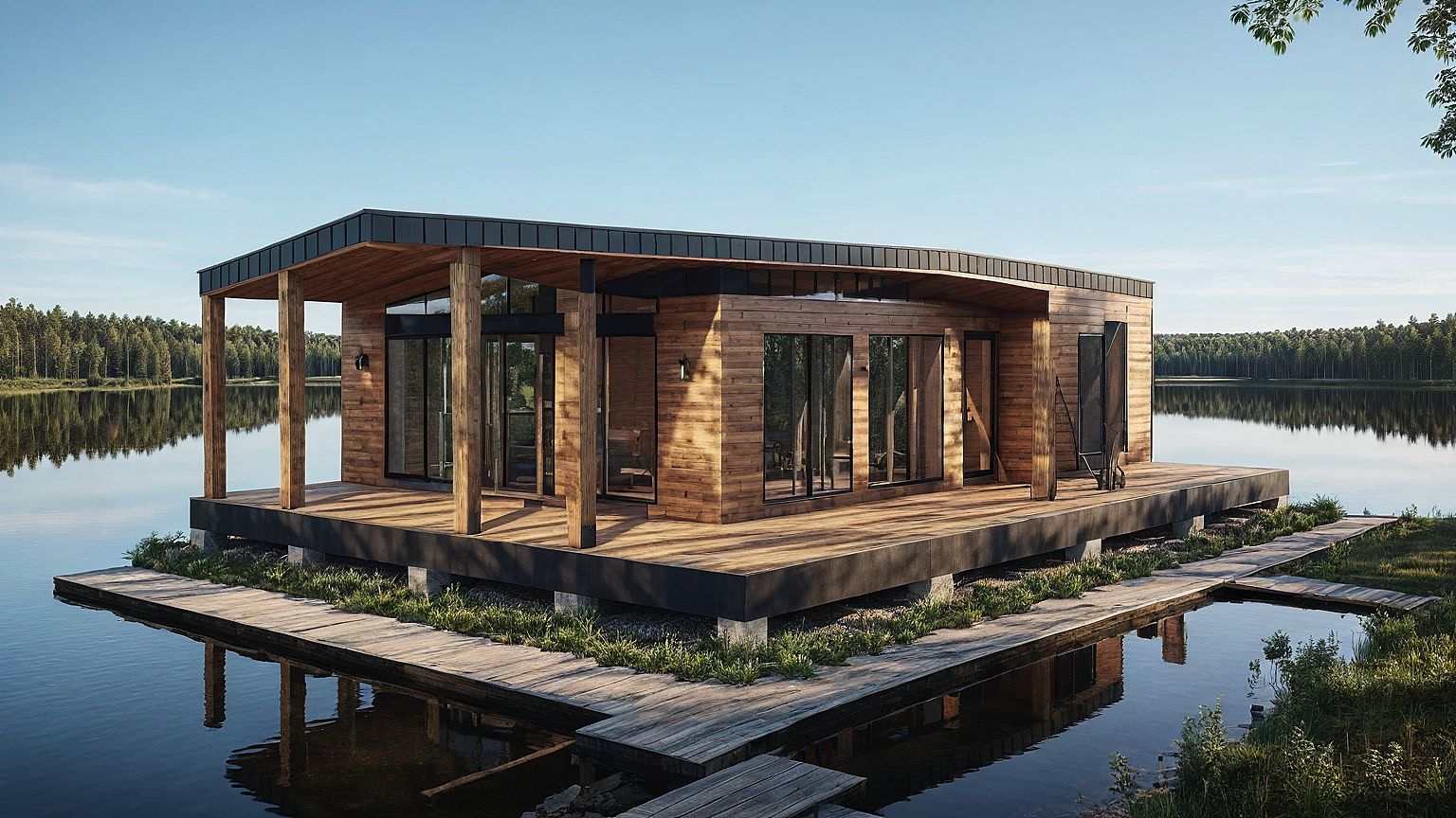 PromptA modern barnhouse with wooden planks. A forest and a lake in background.