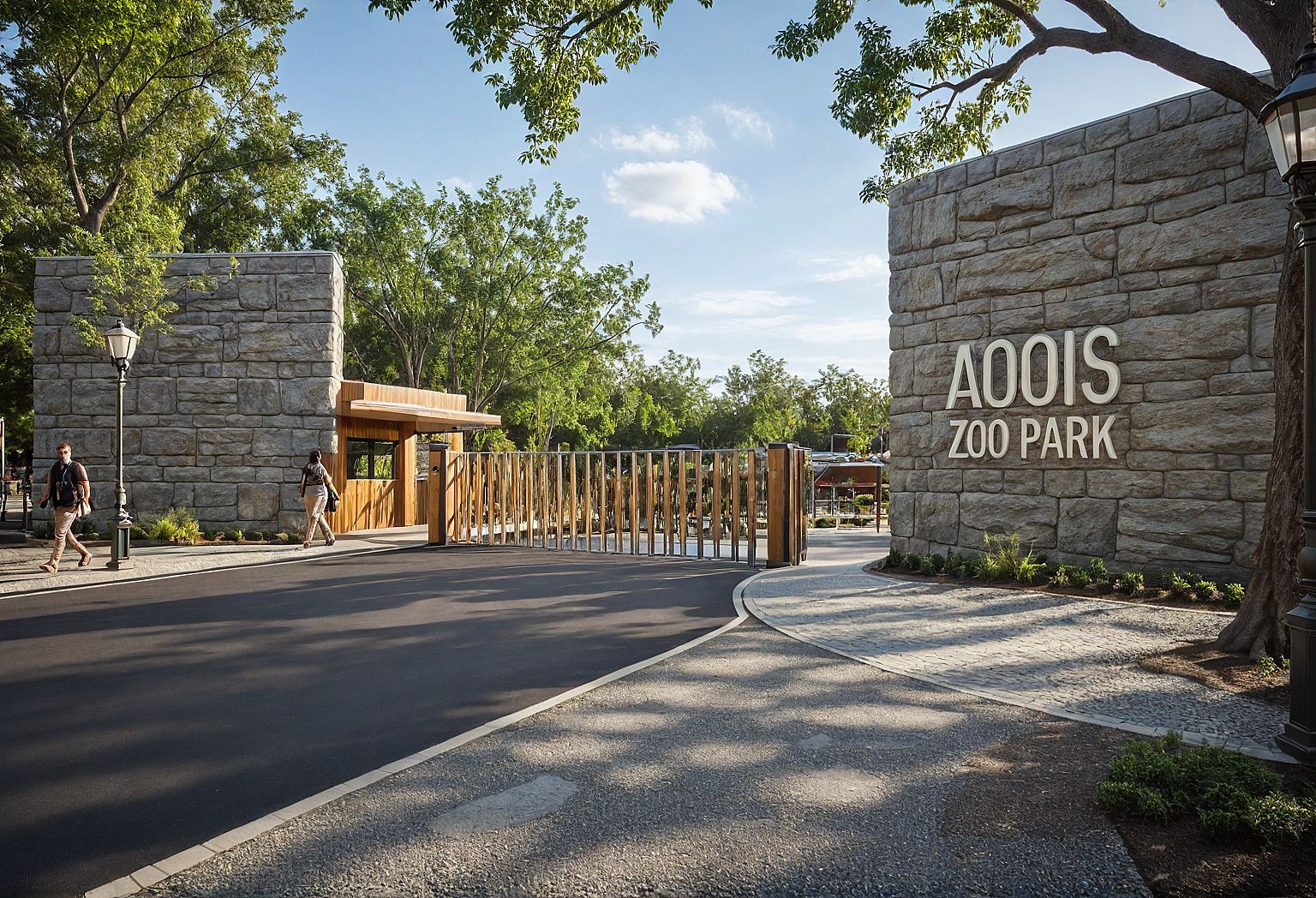 PromptPhoto of a zoo entrance featuring a modern stone structure with wooden accents. Emphasize the textured stone façade, the sleek wooden gate, and ambient greenery surrounding the entrance. Capture the urban setting with nearby park-like landscapes, showcasing pathways and landscaping elements. It's a sunny day with natural light casting soft shadows on the pavement. The camera angle is slightly low, focusing on the entrance while including the warm street lamp on the side, highlighting the welcoming atmosphere of the zoo park entry.