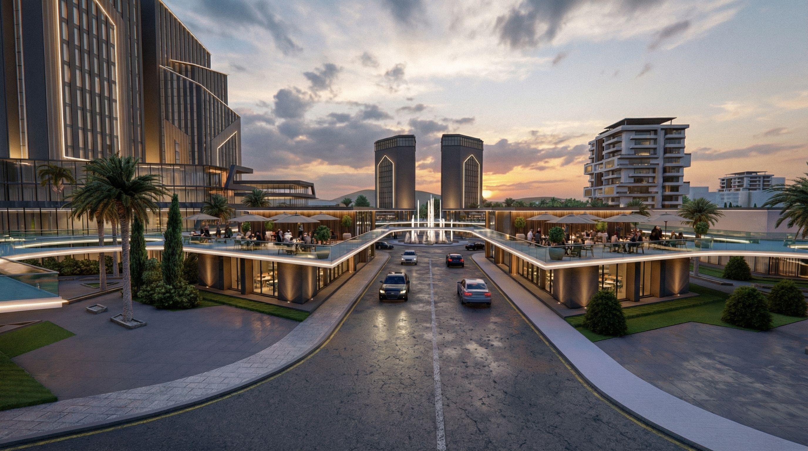 Promptthis is a scene in a buisness center ...the main axe to a twin towers is for cars.. and there is offices and cafeterias along the axe ... enhance the materials .. make everything super realistic and addd people.. and add handrails for the white slab above in the second floor.. add lights ,, make the scene alive ADD LUXURY CAFETRIAS ON THE SECOND FLOOR AROUND THE MAIN AXES ONLY , keep exact camera angle