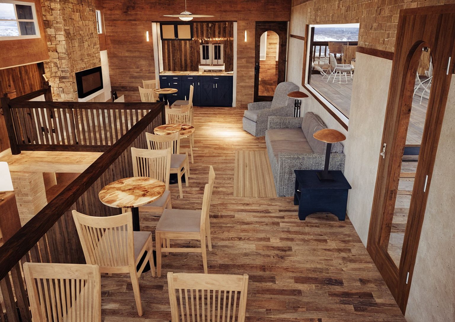 PromptPhoto of a cozy interior space in a rustic cabin, featuring wooden walls and flooring. Emphasize the combination of warm wood textures, stylish furniture, and a stone fireplace. The open layout includes dining tables and a comfortable living area with a couch and lamps. Bright natural light streams through large windows, casting soft shadows. From a slightly elevated angle, capture the inviting atmosphere with a wide-angle lens to show spaciousness and detail in furnishings.