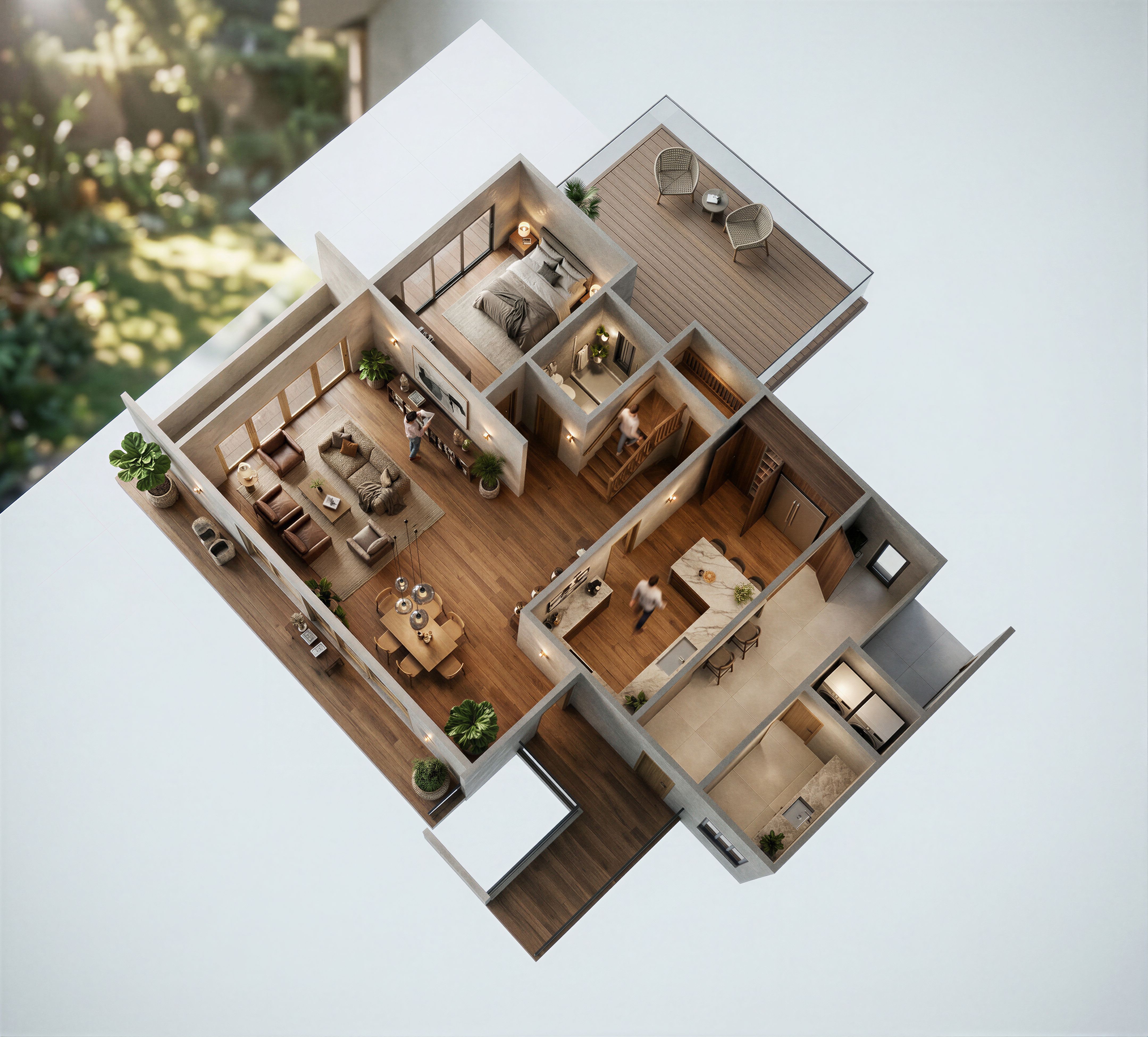 INTERIOR OF A HIGH END HOUSE WITH TIMBER FLOOR FINISHES AND CERAMIC TILES IN THE UTILITY. KITCHEN FURNITURE WITH AN INBUILT PANTRY WITH A DOUBLE DOOR FRIDGE INSIDE. MAKE IMAGE HIGH RESOLUTION 8K. UTILITY WITH WASHER AND DRIER NEXT TO THE KITCHEN. BALCONY WITH SEATS FROM THE MASTER BEDROOM., keep exact camera angle