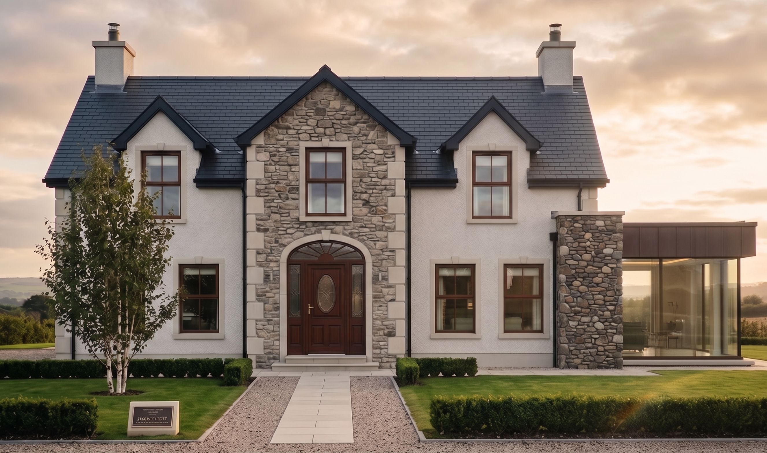 Can you create a more modern extension on to the right side of the house, make no changes to the main structure of the house. Use different materials for the extension and make the middle section of the primary structure the same stone as the extension., keep exact camera angle