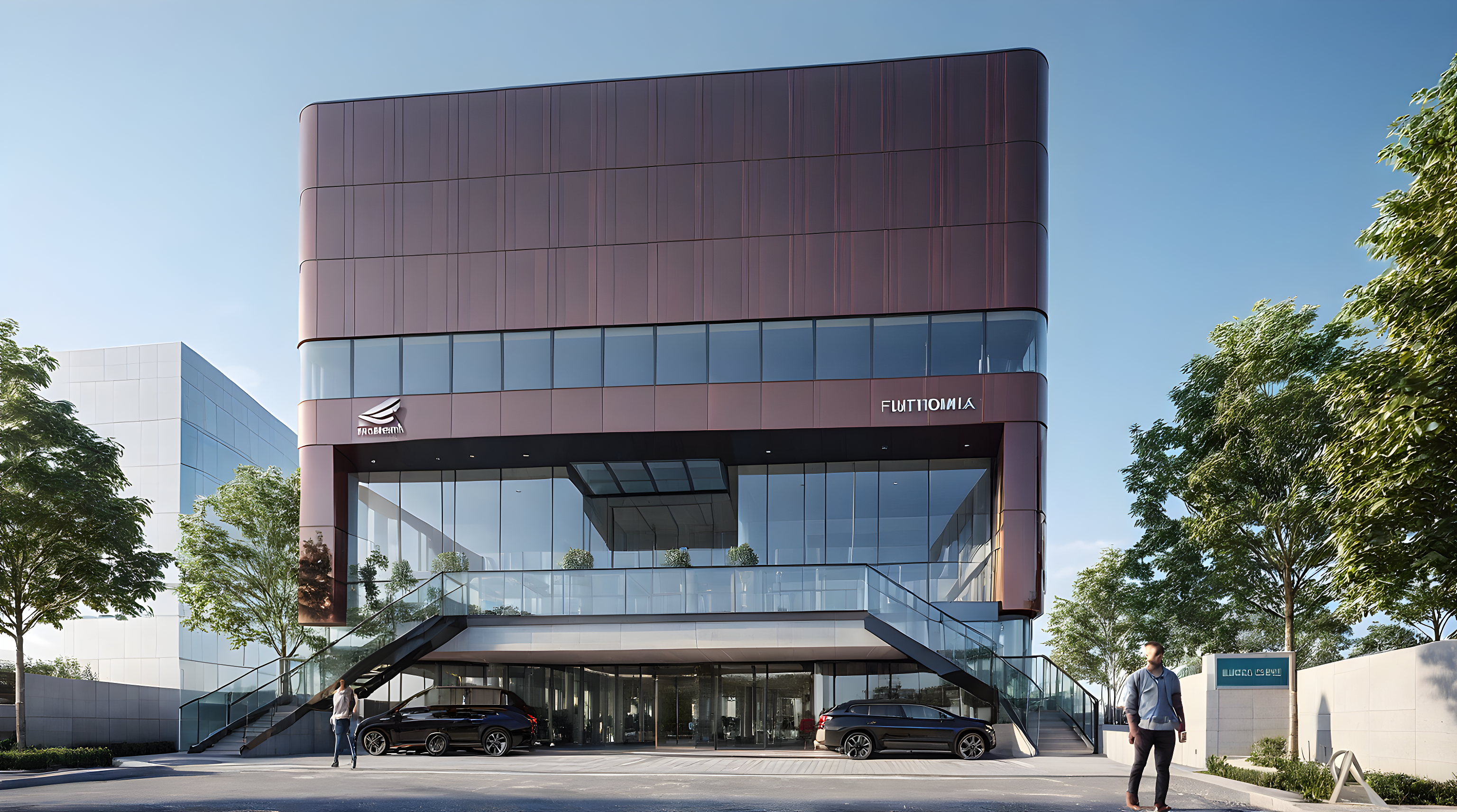 Imagine a modern ultra commercial building with Frist floor glass and second and third floor some fundermax facade and long windows.