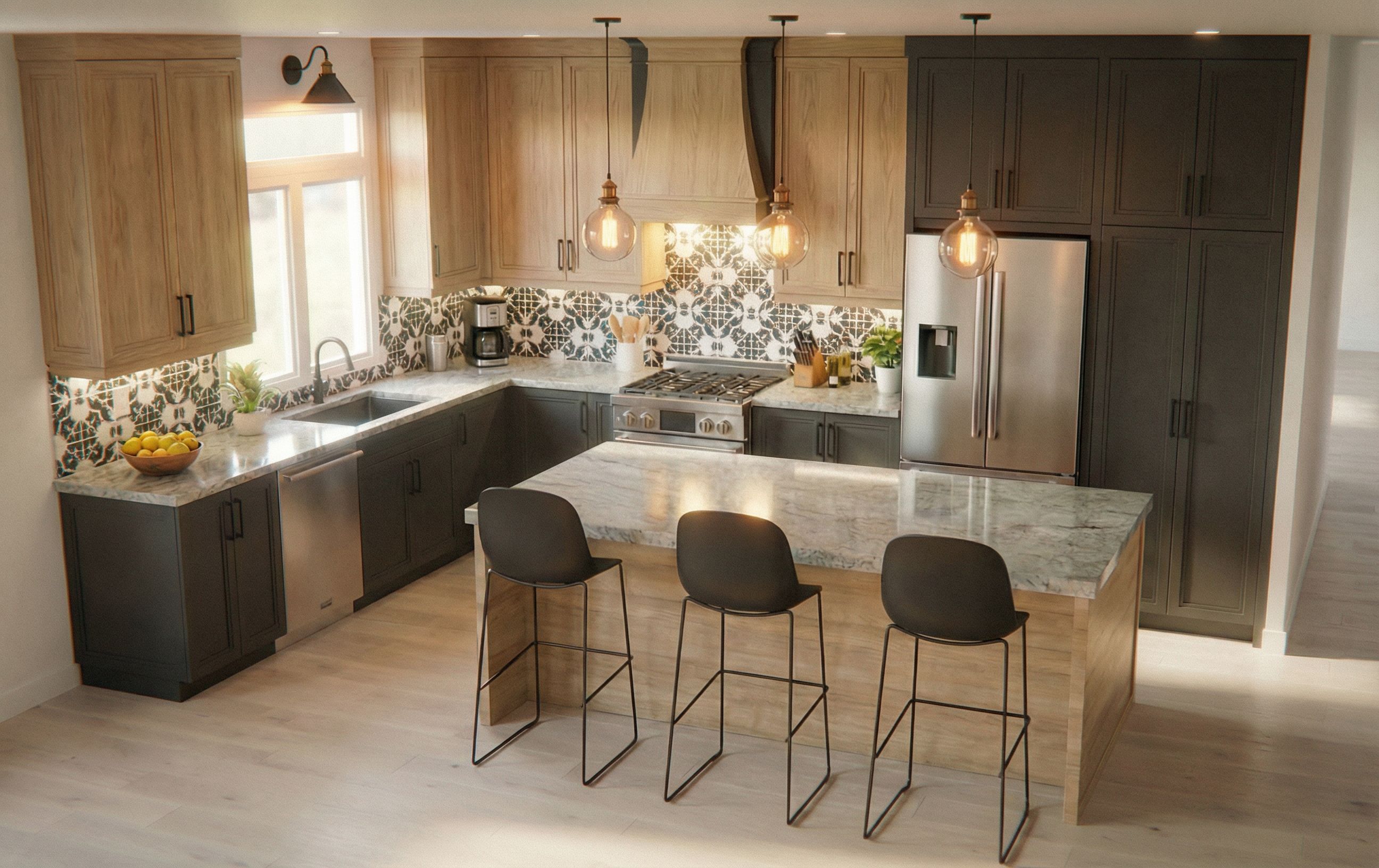 PromptAdd edison style pendant lights above the island, change the floor colour to be lighter in colour, change the window to white with white trim, replace fruit in the bowl with lemons, replace backsplash with a bold black and white mosaic tile, add under valance lighting and trim to upper cabinets, light up the stove area, change the cabinet handles to black, and add a wall sconce above the sink, remove lower cabinet lighting, keep exact camera angle
