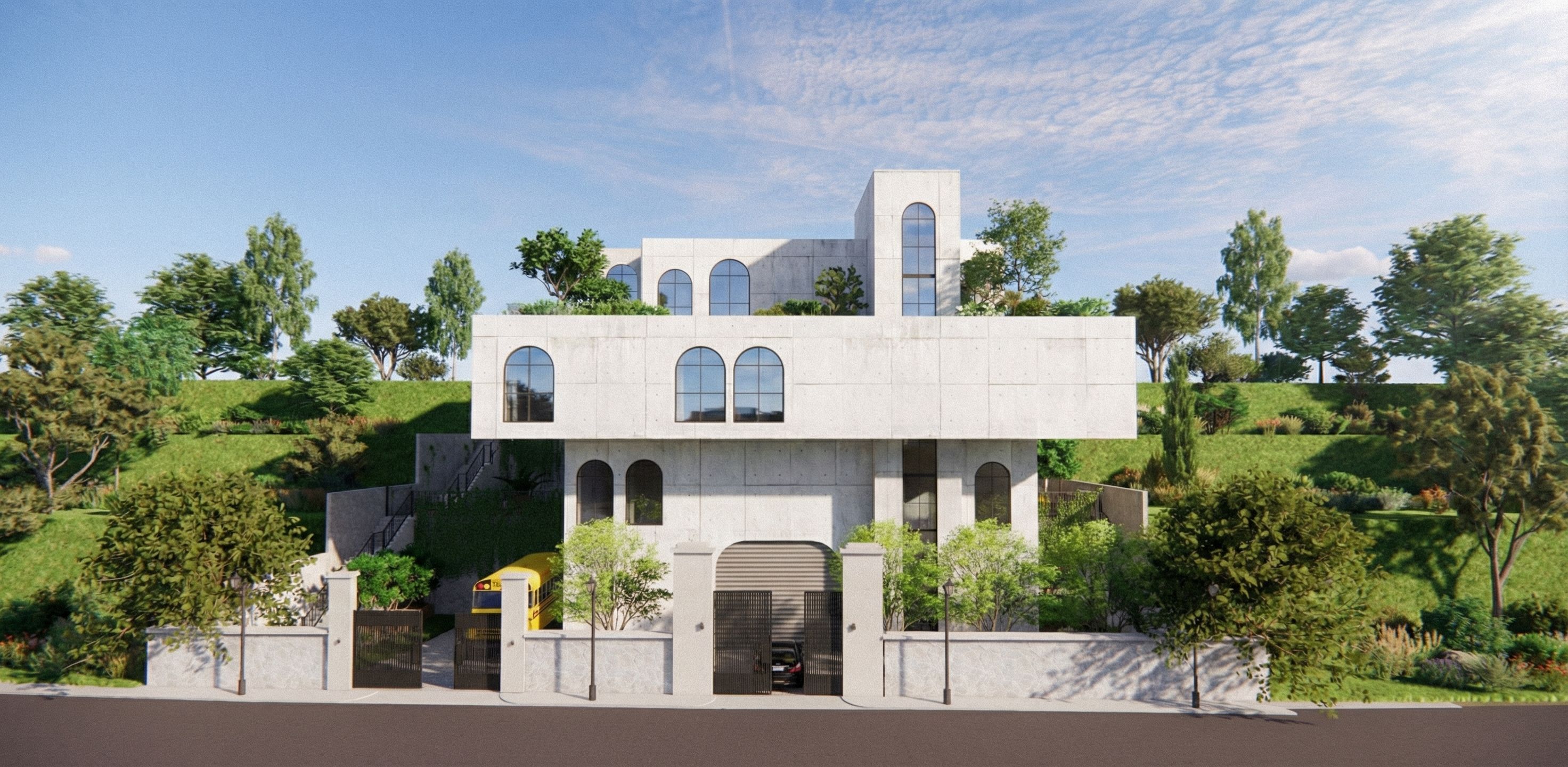 Transform the provided architectural facade into a fully realistic, high-quality image that appears as a completed and fully constructed building. Ensure complete preservation of all proportions, dimensions, geometry, and architectural elements exactly as they are, with no additions, removals, or distortions. Enhance the facade using high-precision, realistic materials already present in the design. The building material is white concrete only, with clear and reflective glass used for the windows. Apply realistic material detailing and subtle imperfections typical of white concrete construction, such as slight texture variation, joints, seams, and natural tonal differences. Use physically accurate lighting, including correct sunlight direction, soft global illumination, natural ambient lighting, and realistic shadows to enhance depth and realism, while maintaining accurate perspective and correct camera angles. Add trees and minimal natural elements in the areas surrounding the project site to suggest sustainability, without overpowering or dominating the building. Create a balanced natural environment with subtle window reflections, delicate atmospheric effects, and refined construction details. The final result should resemble a professional architectural photograph of a completed building, highly realistic, clean, modern, and visually convincing., keep exact camera angle