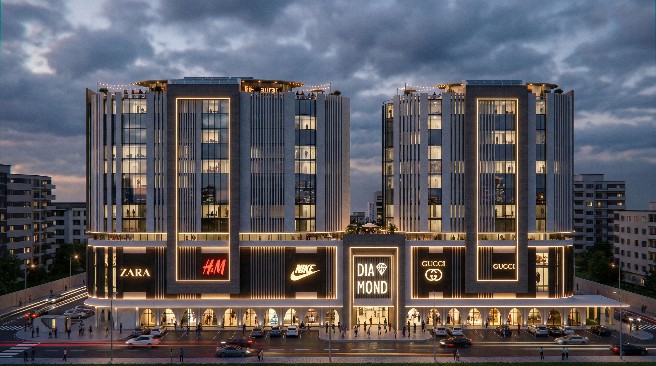 Photo of a modern commercial building featuring sleek glass and concrete façades, emphasizing vertical lines and a striking entrance with illuminated signage. Surrounded by a bustling urban landscape, with adjacent structures enhancing the city vibe. Captured during twilight, showcasing dramatic cloud formations and reflections on glass surfaces. Shot from a straight-on perspective with a wide-angle lens to enhance scale and depth, highlighting architectural details and textures within the composition. and the podium is a commercial center mall add to the elevation the some large logos of clothes brands with light behind add linear lights and add people enjoying shopping at the entrance and there are restaurants on the rooftops but without changing the architecture ;and make it super realistic and add lights inside as there are people living in the apartments, keep exact camera angle, keep exact camera angle