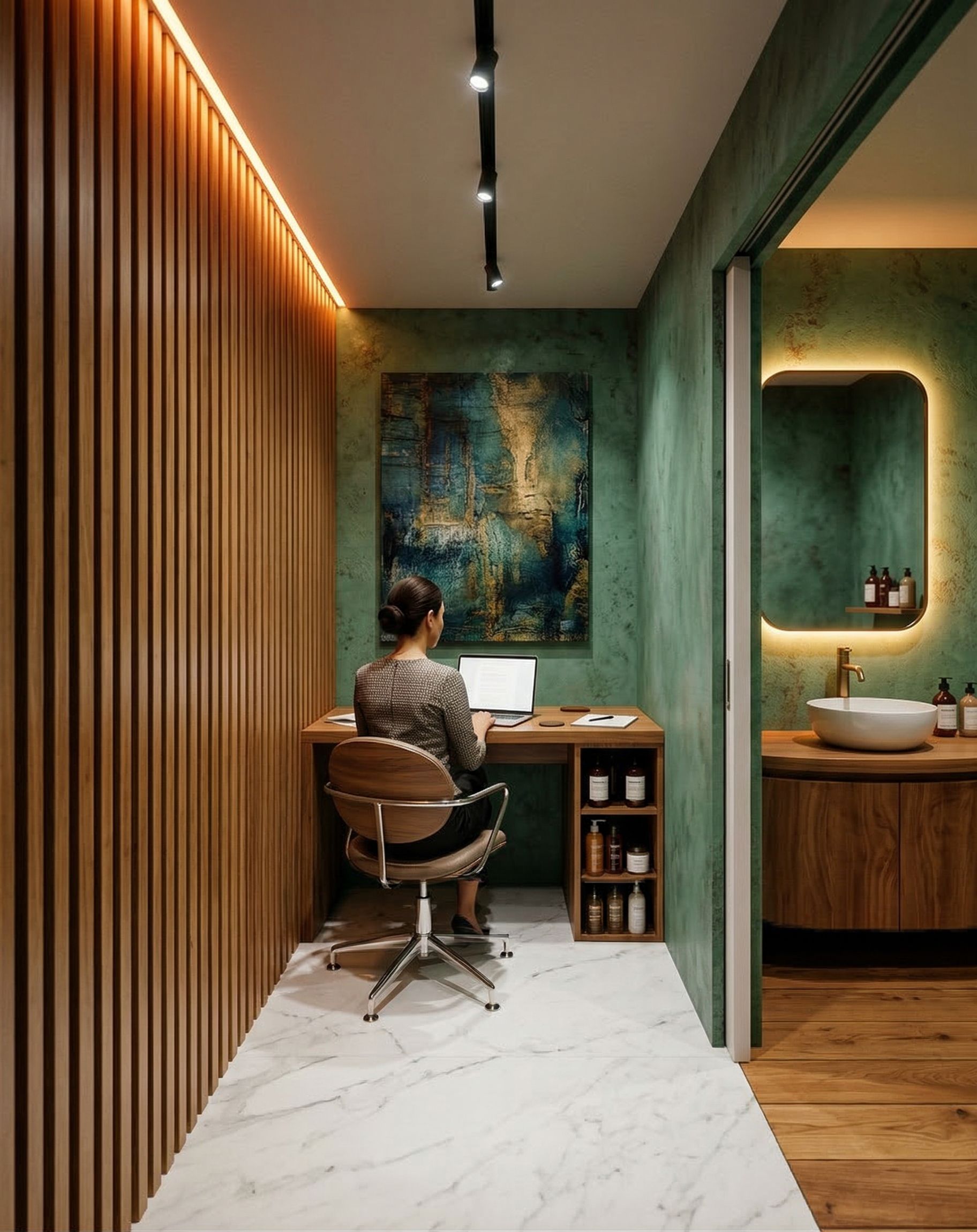 this is a picture of a working room which is directly connected to a bathroom on t5he right side. dont change any of the layout of the furniture. the flooring is out of white marmor and the left side wall ia covered with wooden lamellen. which is illuminated by horizontal LED ember coloured light from a slit on the ceiling. the working desk is out of wood too and the add a working chair in front of it. Add a laptop and a working women facing the laptop on the desk. rest of the walls are coloured with the same texture and colour like the reference picture i uploaded. Add shampoos and lotion bottles on the shelves beneath the desk. Add a nice artwokr on the wall infront of the desk. The WC has wooden flooring and the walls are green aswell. the Miror has LED ember light in the background add railed spot light system on the middle of the ceiling of the working room the ceiling is flat
