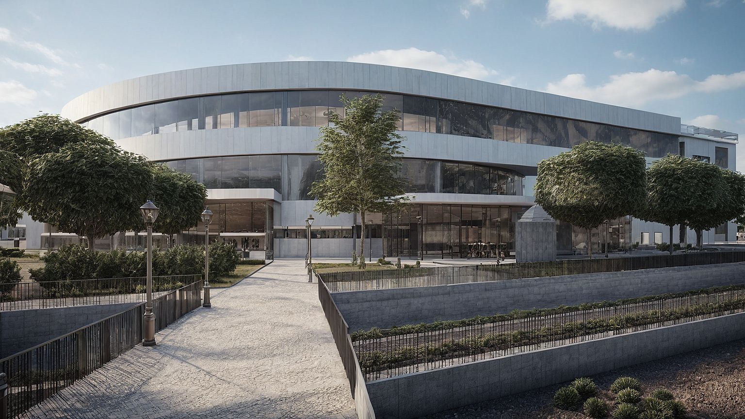 render the facade of this building without changing the materials BUT ENHANCE THEM. Keep the setting as is. This is a museum in a social district
