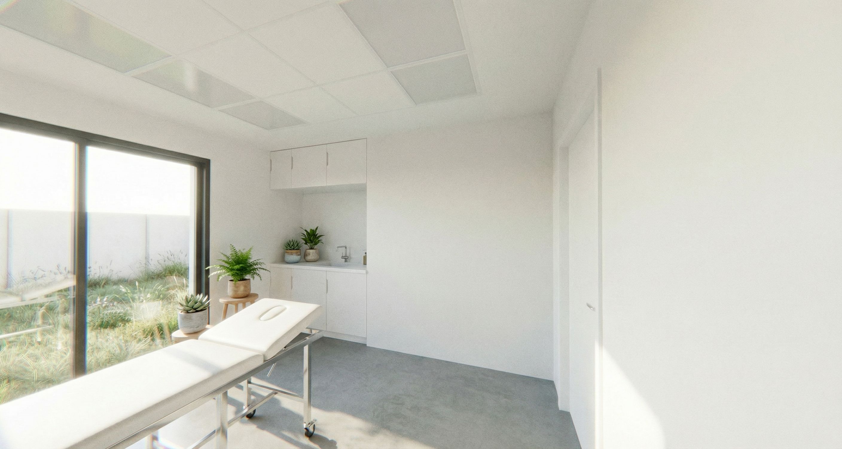 Promptkeep the render as it is. change only the following points : 1-replace red tiles by white paint. 2-use a concrete texture with less effects on the ground. 3-add plants