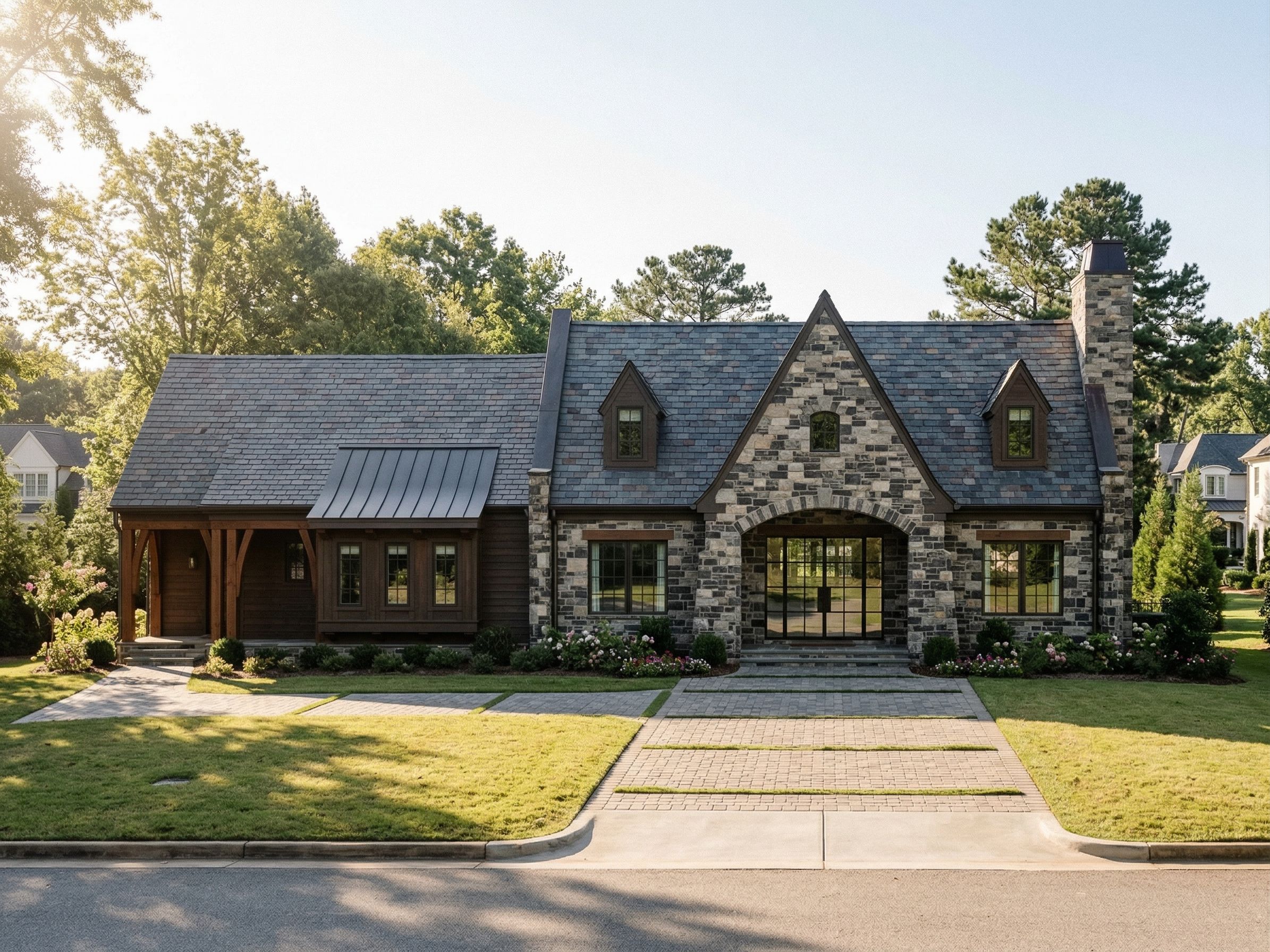 PromptRender this modern european cottage residence. Mid morning lighting. Established neighborhood. chocolate dark tones. Mix of natural mix of dark and light stone veneer, dark brown stained timber. dark Curved outward metal roof over protruded cantilever with long overhang and long curved brackets. Square door. Arched porch opening.