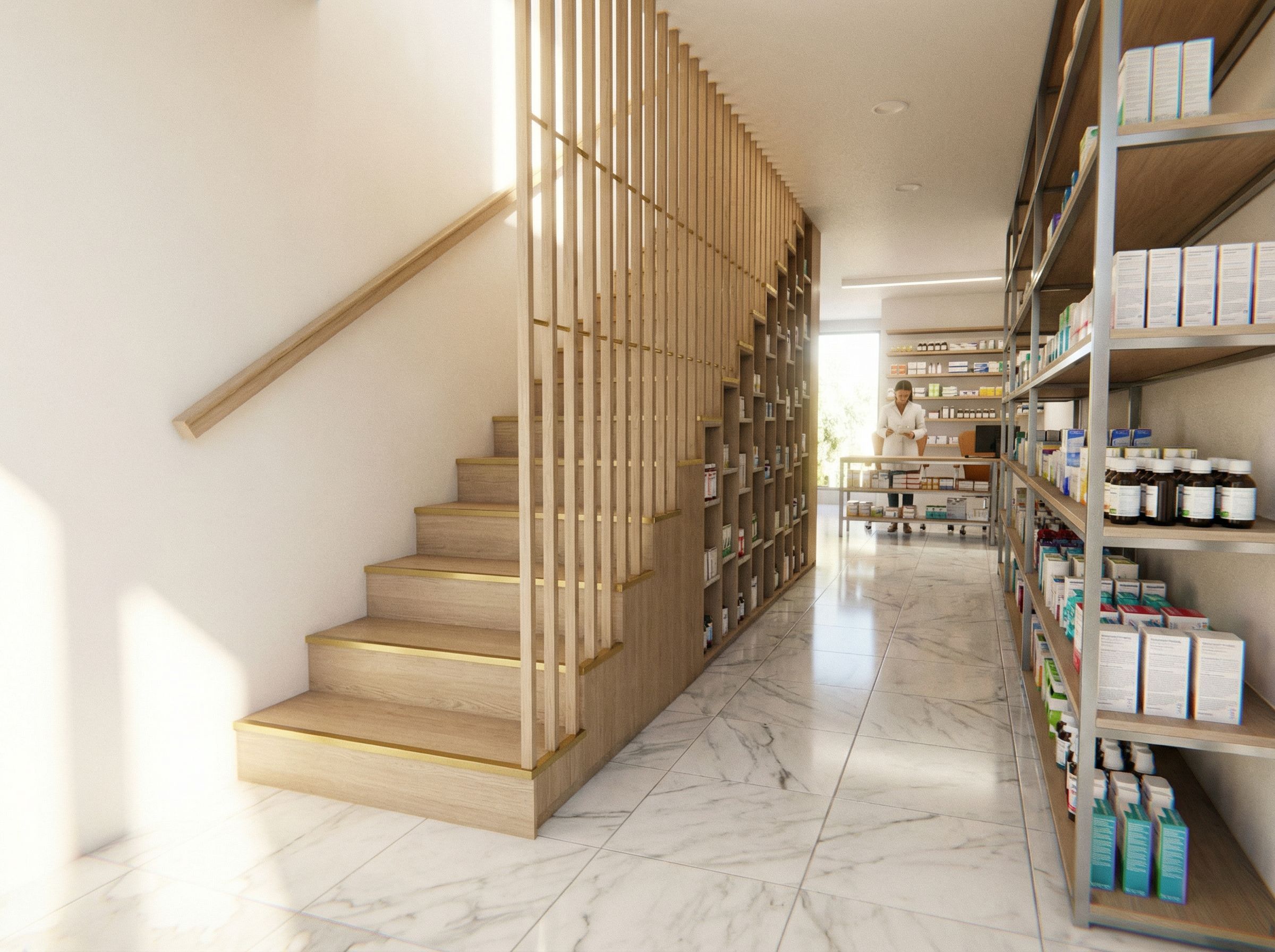 Promptmake this ultra high quality rendering. It is a pharmacy. Cosy vibe. Put elegant marble floor, not so much wood in general. Dont add any plants or sofas. , keep exact camera angle