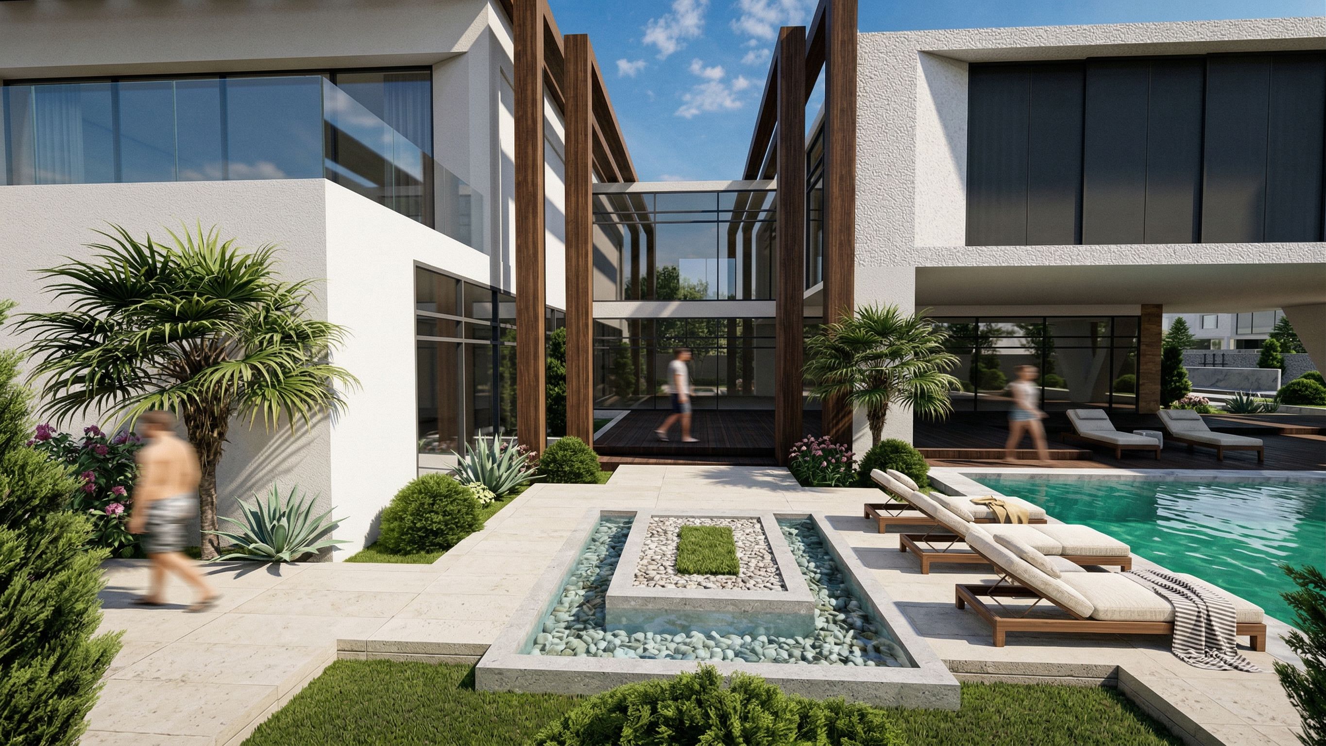 PromptUltra-realistic rendering of a modern villa with large, elegant swimming pools, featuring luxurious chaise lounge chairs and stylish poolside furniture. Add floating pool lanterns or soft, ambient lighting around the pool area for a serene evening effect. The pool area should have high-end materials like natural stone and ceramic tiles with rich textures. The lounge chairs should have plush cushions, sleek modern design, and some scattered beach towels for a relaxing atmosphere. Include a variety of plants, such as tall palm trees, decorative bushes, and vibrant greenery along the poolside for added natural beauty. The trees should have realistic textures, with subtle details like varying leaf shapes, branch patterns, and shadows. The tree trunks should appear textured with natural bark patterns. Strategically place them to enhance depth, with some trees slightly framing the villa, others near the pool for shade, and some in the background. Focus on soft, natural lighting with realistic shadows, light reflections on the water, and gentle gradients on the tree foliage. The villa’s outdoor space should feel upscale, tranquil, and inviting, with attention to fine details in both the architecture and landscape design., keep exact camera angle, keep exact camera angle