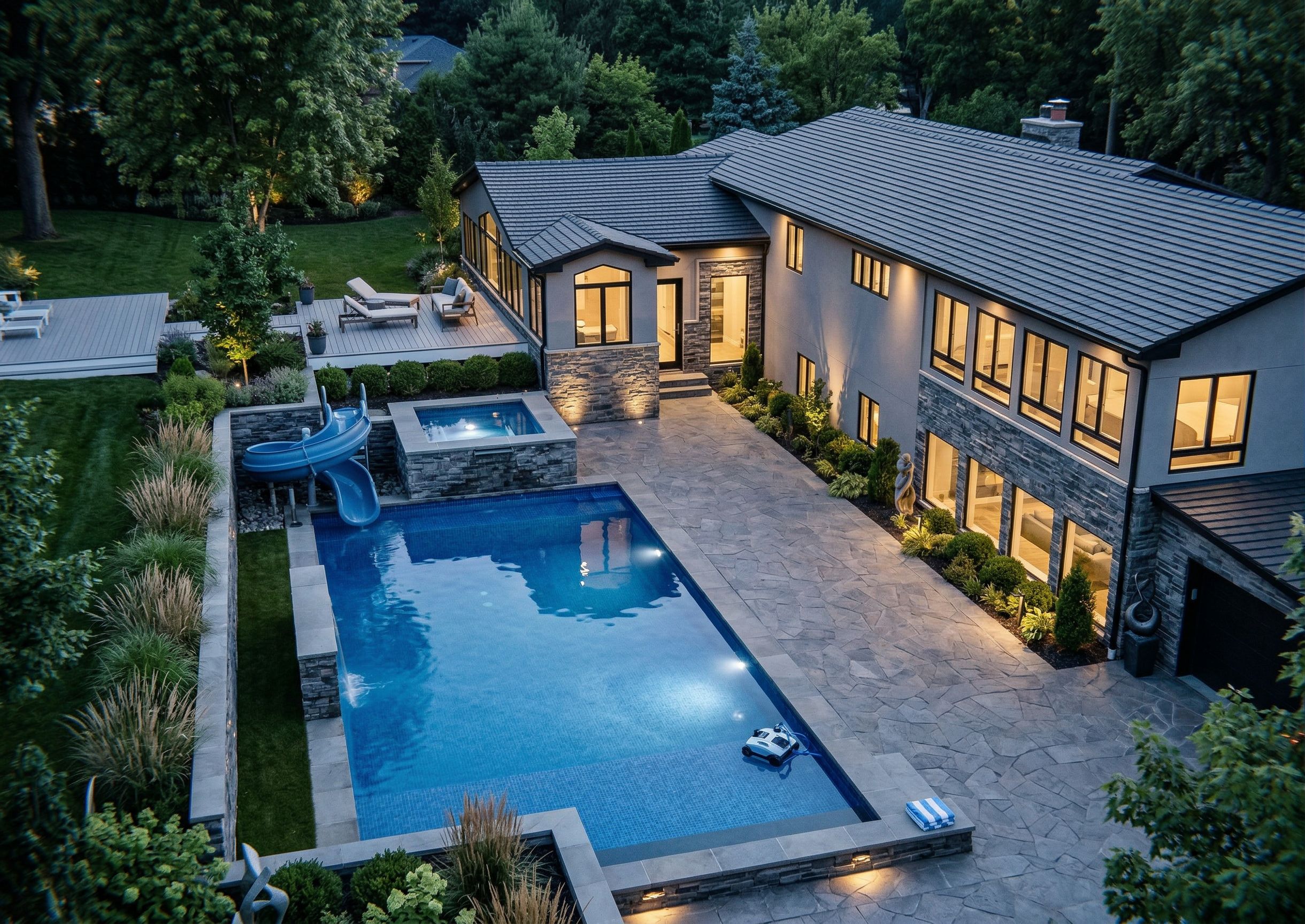 Photo of a contemporary residential home featuring a spacious pool area with a water slide. Highlight the sleek materials and modern architectural details, including large glass windows and textured stonework. Set in a well-manicured urban landscape, surrounded by greenery. Natural daylight illuminates the scene, casting soft shadows that enhance the textures. Captured from a high-angle perspective, using a wide-angle lens to emphasize the pool and adjacent structures in the foreground., keep exact camera angle