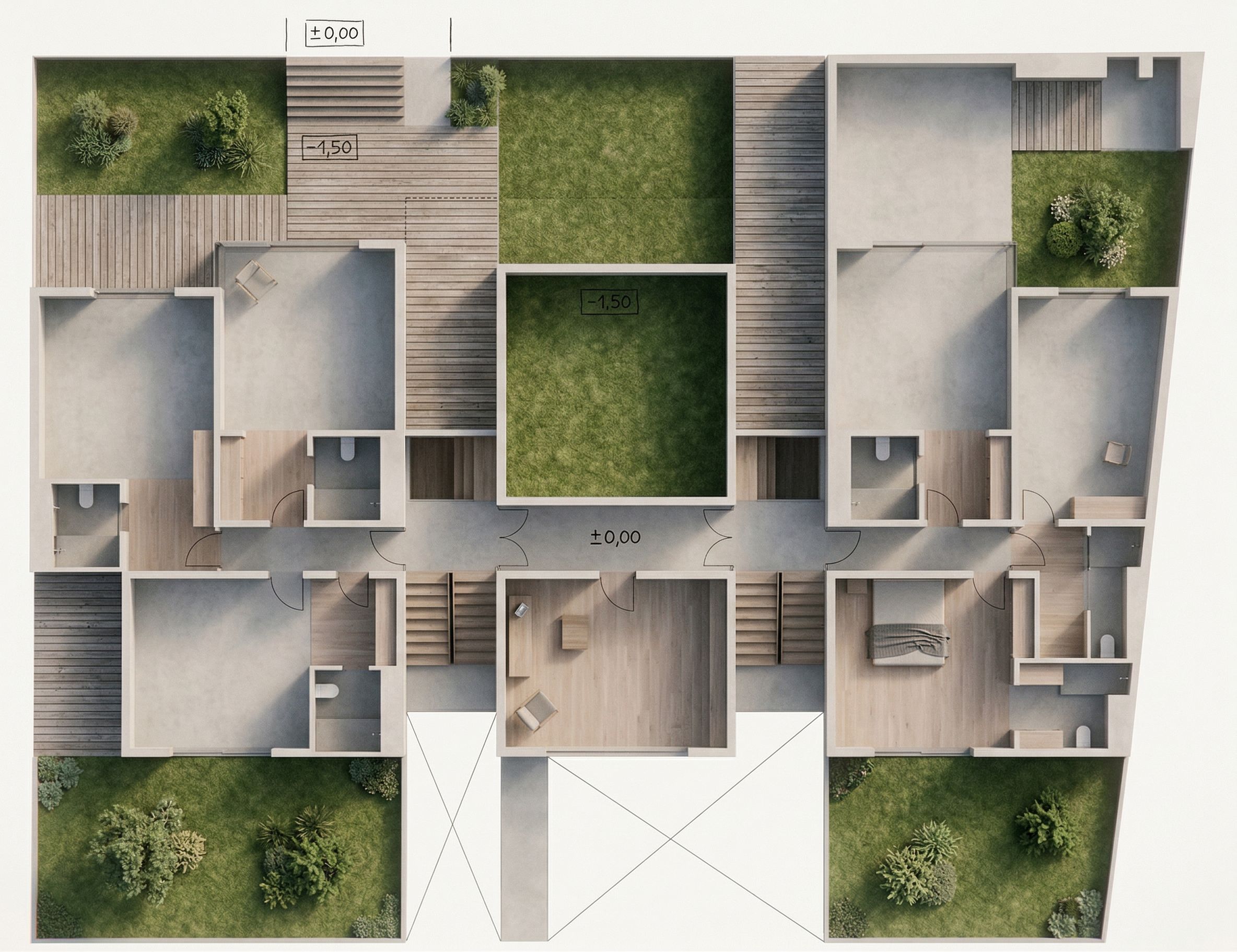 Plano realista con colores suaves. Respetar las volumetrías y la distribución de la planta. Todo lo verde son patios con césped, no interpretes, no hay agua, las plataformas son de tablones de madera para exterior, keep exact camera angle