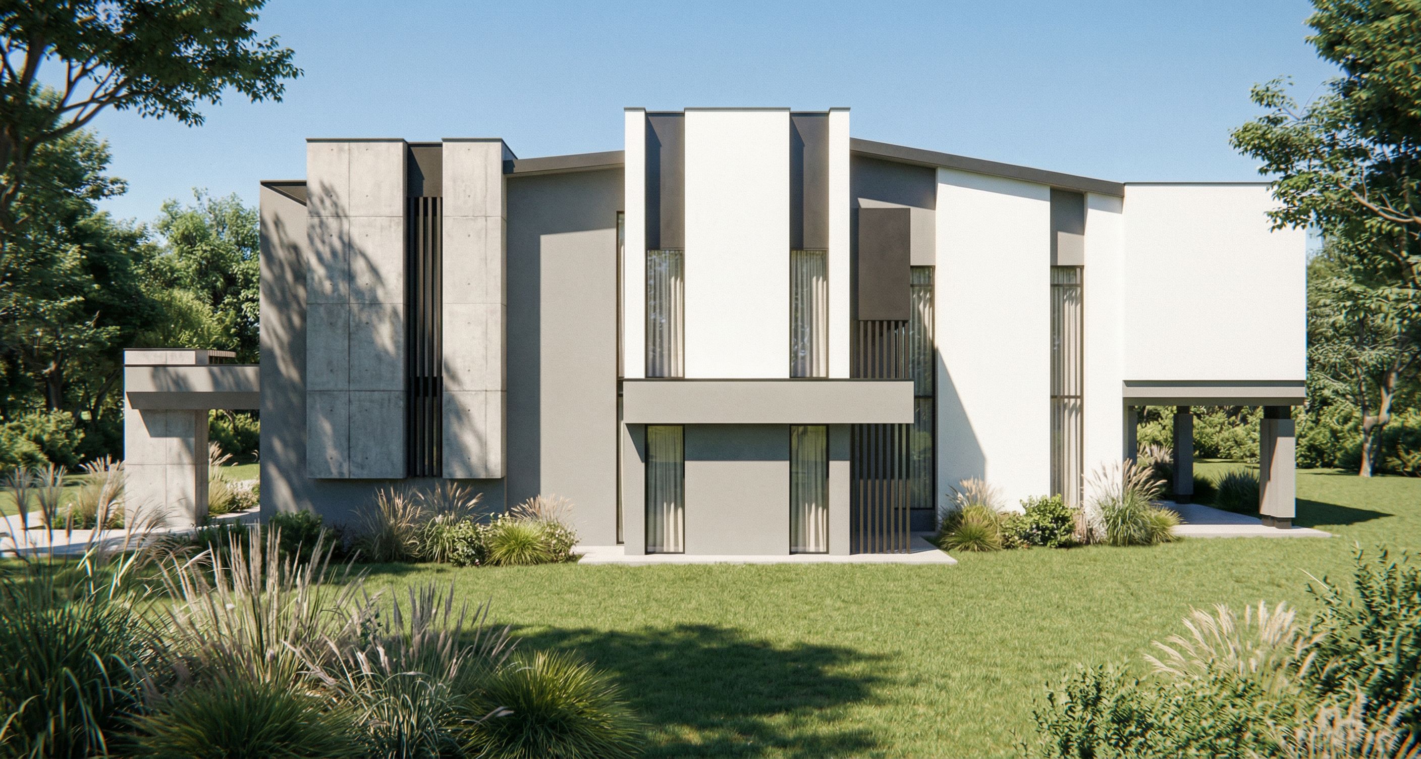 Promptmodern minimalist concrete house, two-story contemporary architecture, **right side facade of the house**, lateral right elevation view, exposed concrete facade, large cantilevered roof, floor-to-ceiling glass windows with light curtains inside, dark metal accents and vertical wood slats, open side view of the house structure, combination of exposed concrete, **white paint and light gray paint finishes**, minimalist architectural composition. **Apply white paint exactly in the area marked with the green square in the reference image.** **In the area marked with the red square in the reference image, remove the windows and replace them with a smooth wall finished with light gray paint.** Keep the rest of the materials exactly as in the original reference. **No cars, no driveway, no garden pathways or stepping stones.** Natural landscaping only with ornamental grasses, shrubs and trees surrounding the side of the house, clean lawn area, calm residential environment, bright daylight scene, clear sky, soft natural sunlight, realistic shadows, architectural photography style, ultra realistic materials, global illumination, highly detailed textures, photorealistic architectural visualization, 8k render. IMPORTANT: strictly preserve the architecture from the reference image, do not redesign the building, do not change the facade layout, do not add or remove volumes or structural elements, keep the exact same building shape, proportions, massing, structure and architectural composition. Maintain the original architectural design exactly as in the reference image. **Only modify the areas indicated by the green and red squares as specified.** strictly follow the reference image architecture and keep the exact camera angle. , keep exact camera angle